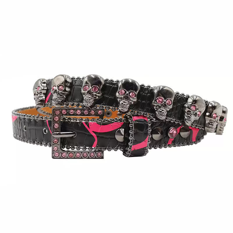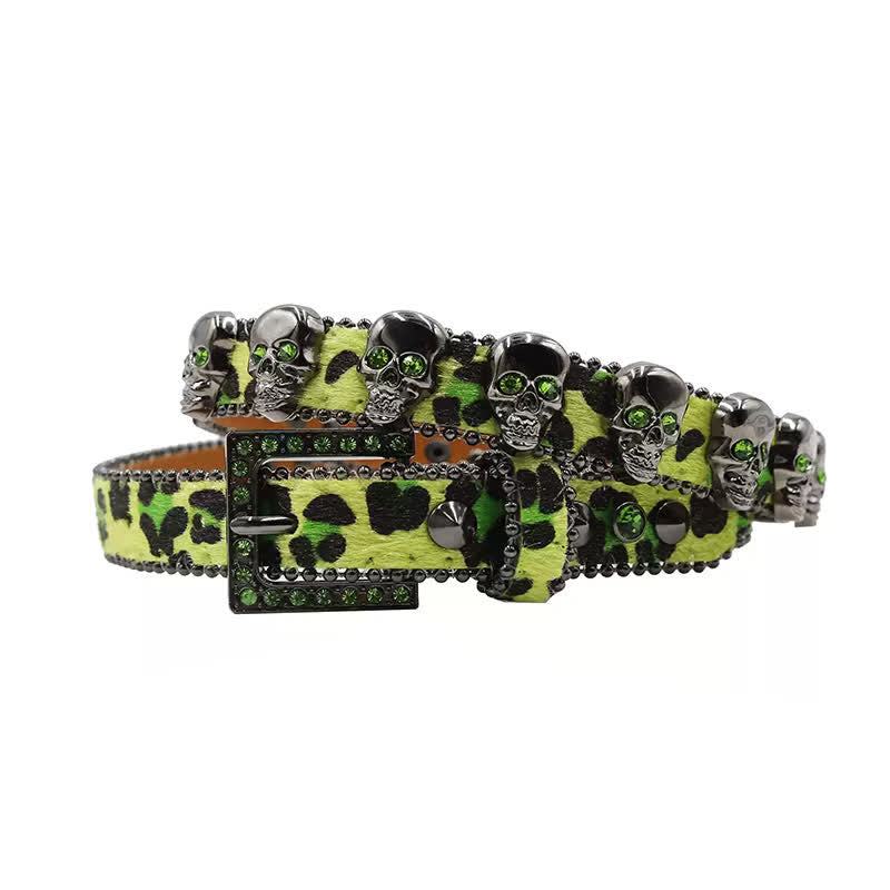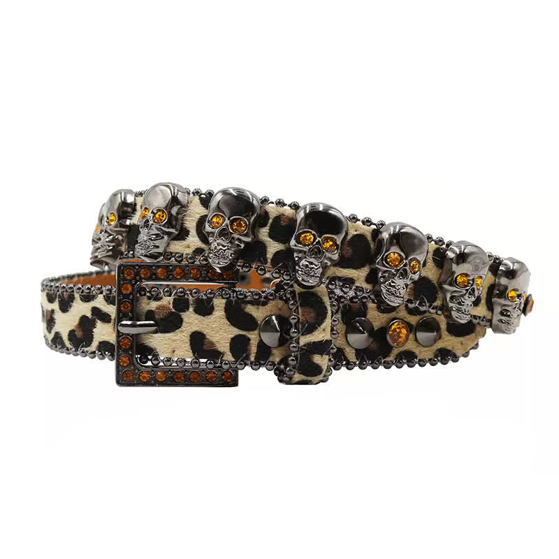 Fancy Gothic Skull Head Rivets Leopard Print Leather Belt