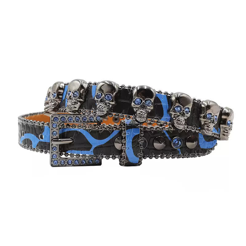 Fancy Gothic Skull Head Rivets Leopard Print Leather Belt - Blue - 40 - image 13