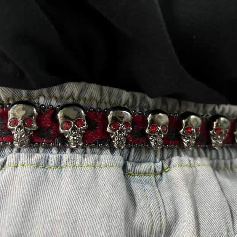 Fancy Gothic Skull Head Rivets Leopard Print Leather Belt - Red - 40 - image 0