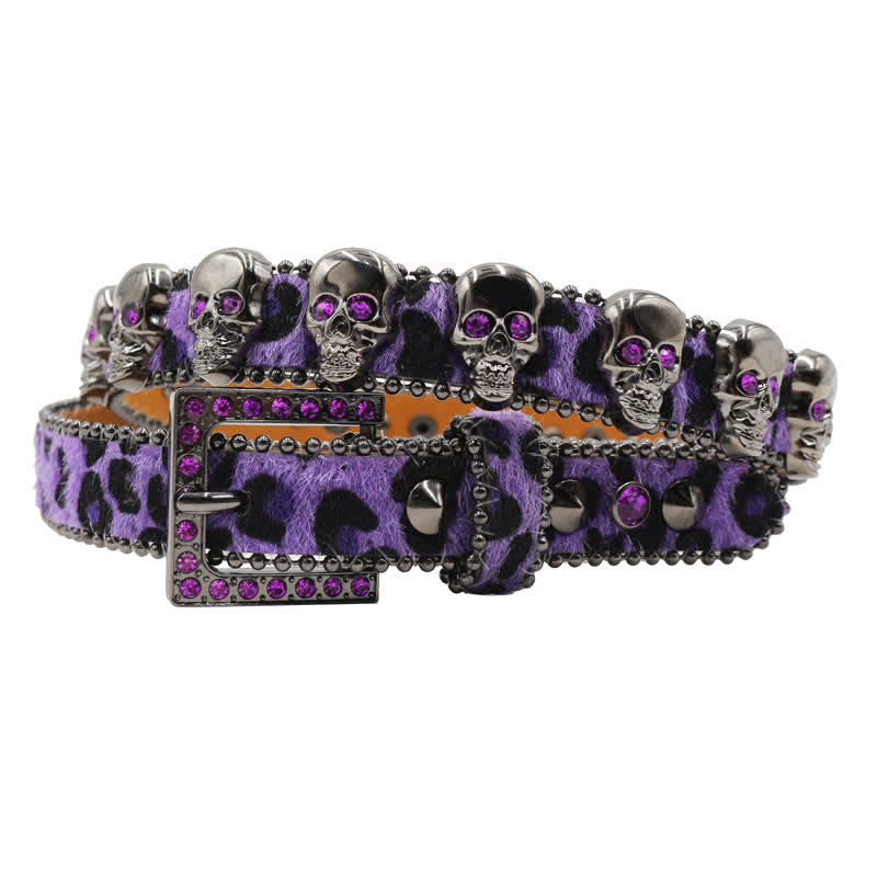Fancy Gothic Skull Head Rivets Leopard Print Leather Belt - Purple - 40 - image 11