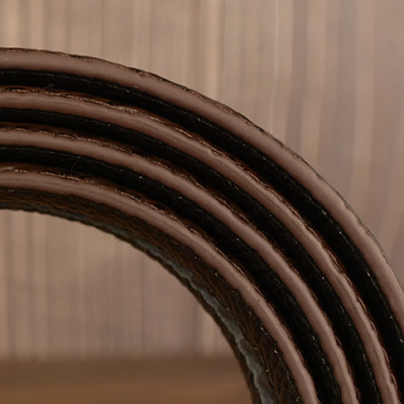 • Just slide the dress belt into the sliding buckle and pull leather belt through, the ratchet buckle auto-locks.