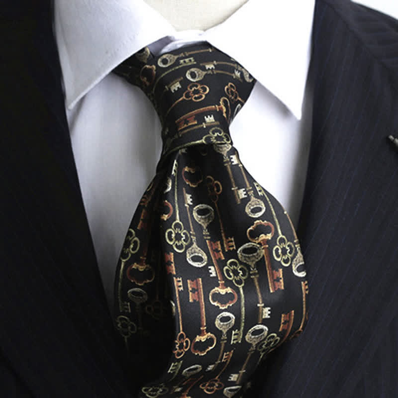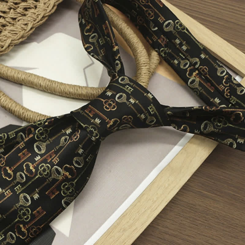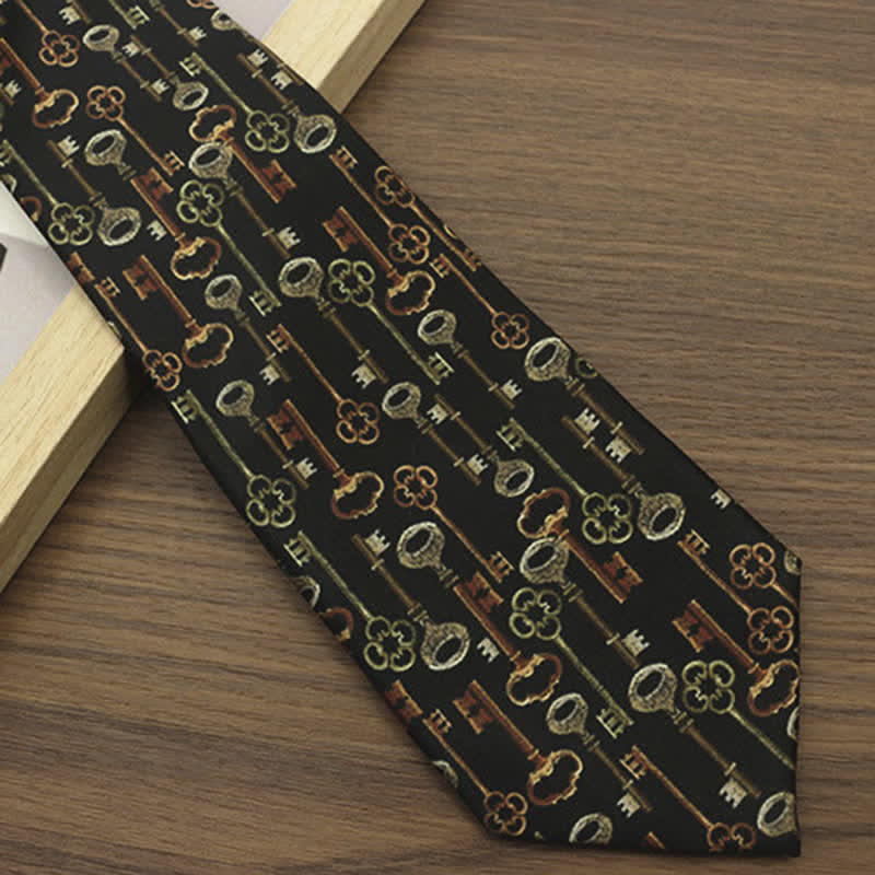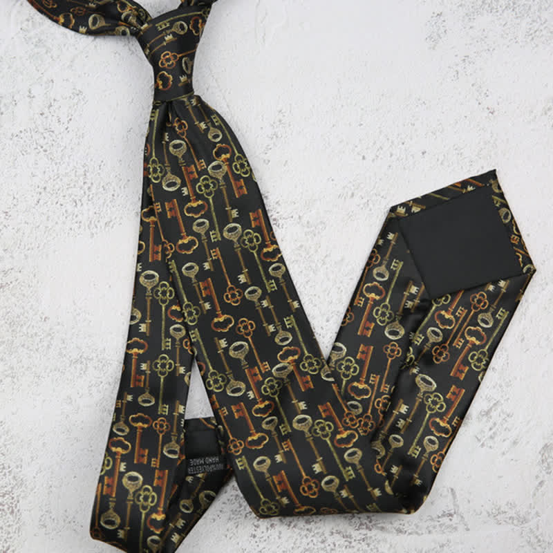 This sophisticated accessory features a captivating pattern of intricately designed skeleton keys against a sleek black background. Whether you're attending a formal affair or adding a dash of refinement to your everyday attire, this necktie effortlessly combines classic charm with contemporary flair.
