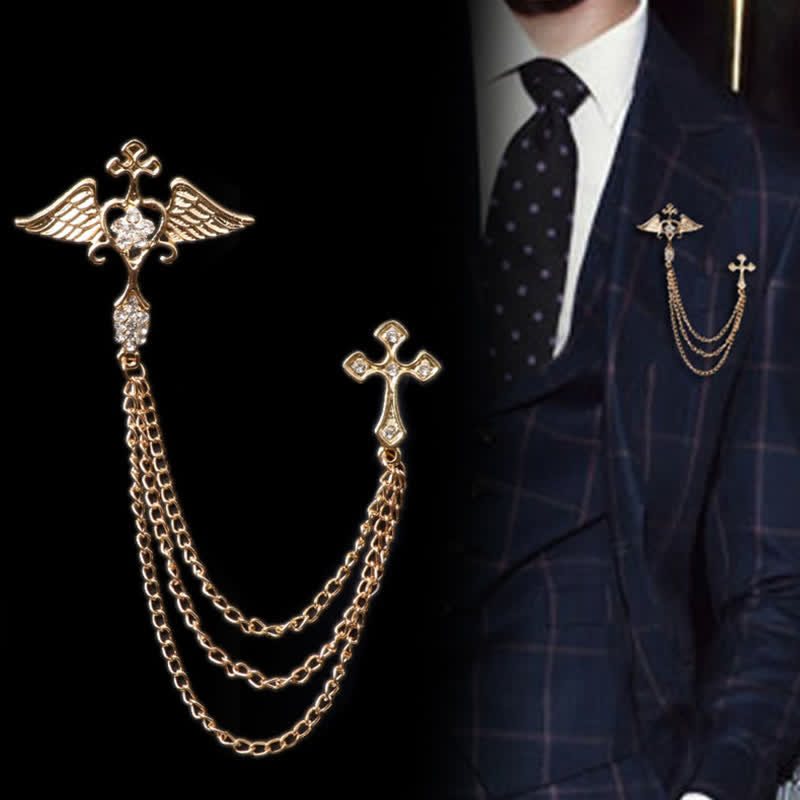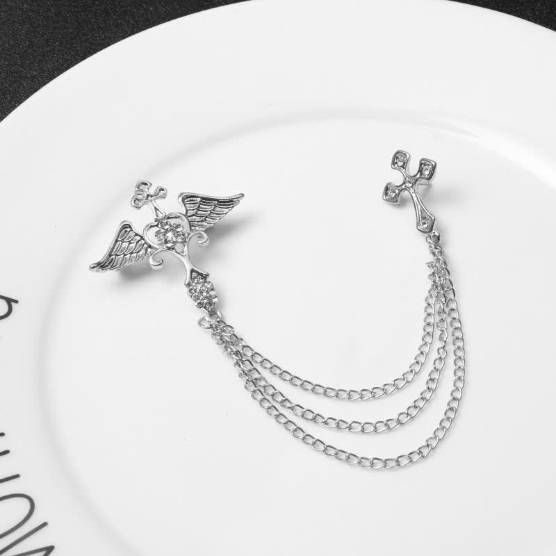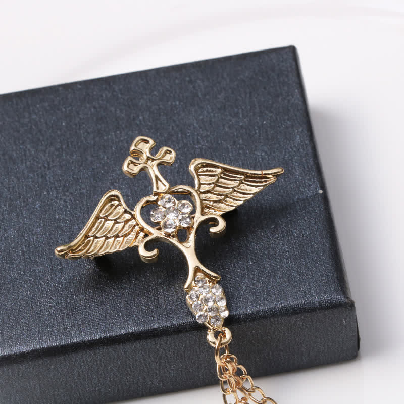 - Stylish wing and cross brooch decorated with heart, rhinestones and tassel chain, looks more elegant and eye-catching.