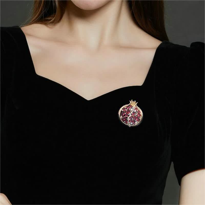 - Featuring a gold pomegranate-shaped, on it are sparkling red garnets to represent the seeds.