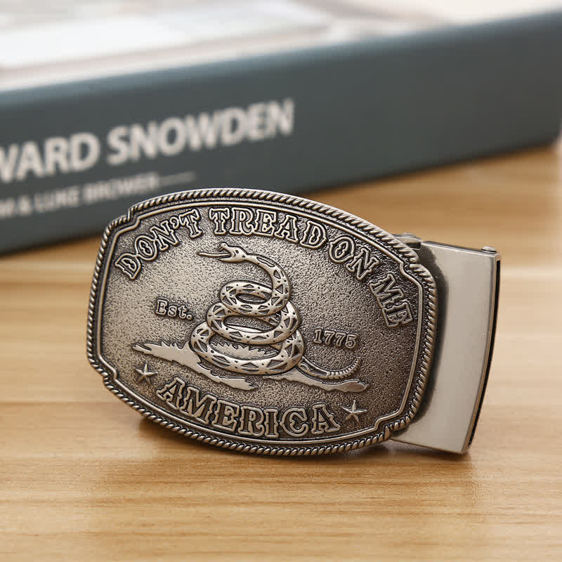 - This Attitude buckle features a smooth edge with a snake and the words "Don't Tread On Me" across the top.