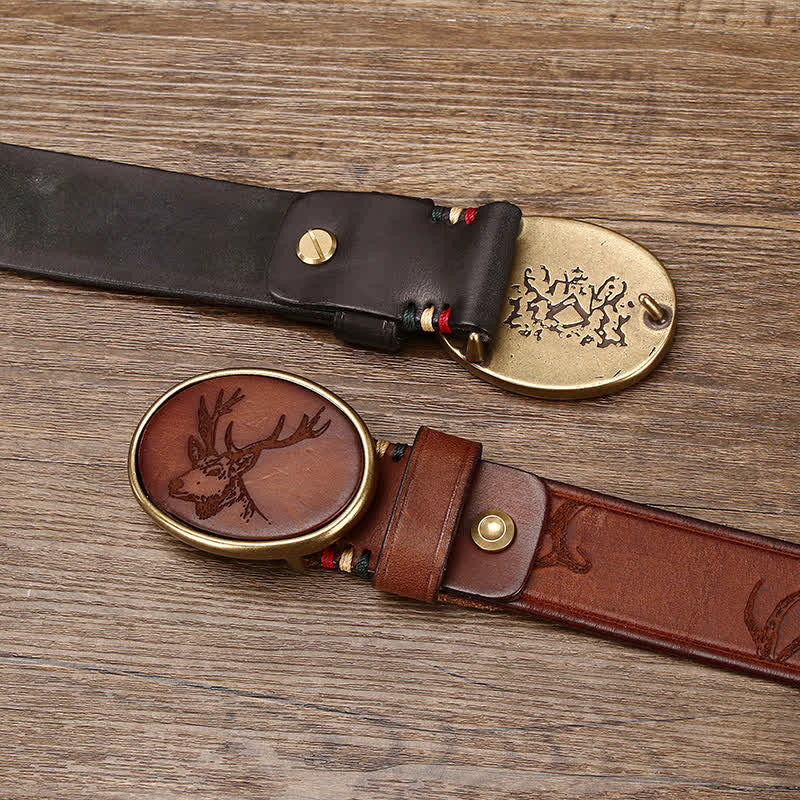 A textured belt is indispensable for daily wear. This buckle features a deer head pattern and the strap has antler pattern. It is a practical and versatile item no matter the four seasons or any style.