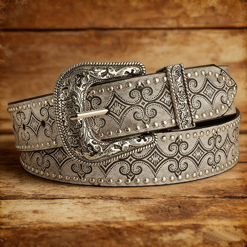 - This western-styled belt is crafted from soft and durable leather, highlighted by an elaborate carved decorative buckle and rivet detailing that brings distinctive rugged retro charm.