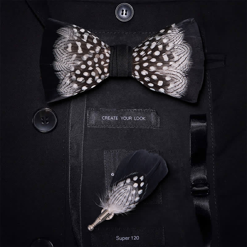 - Features: The addition of white polka dots feathers interwoven throughout the black background adds an unexpected element of contrast and interest, making this bow tie stand out from the rest.