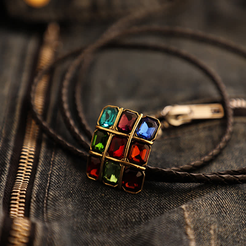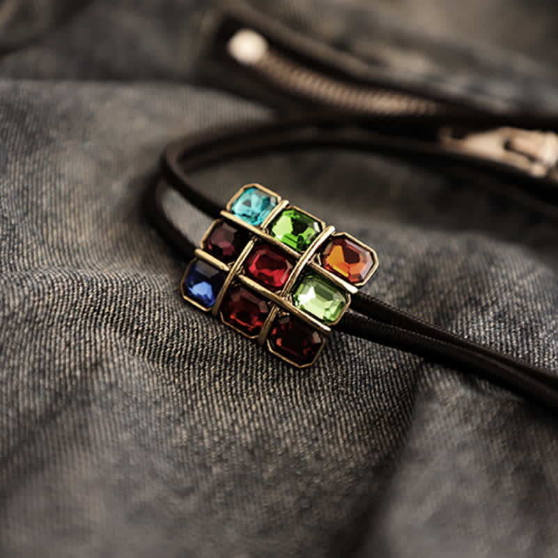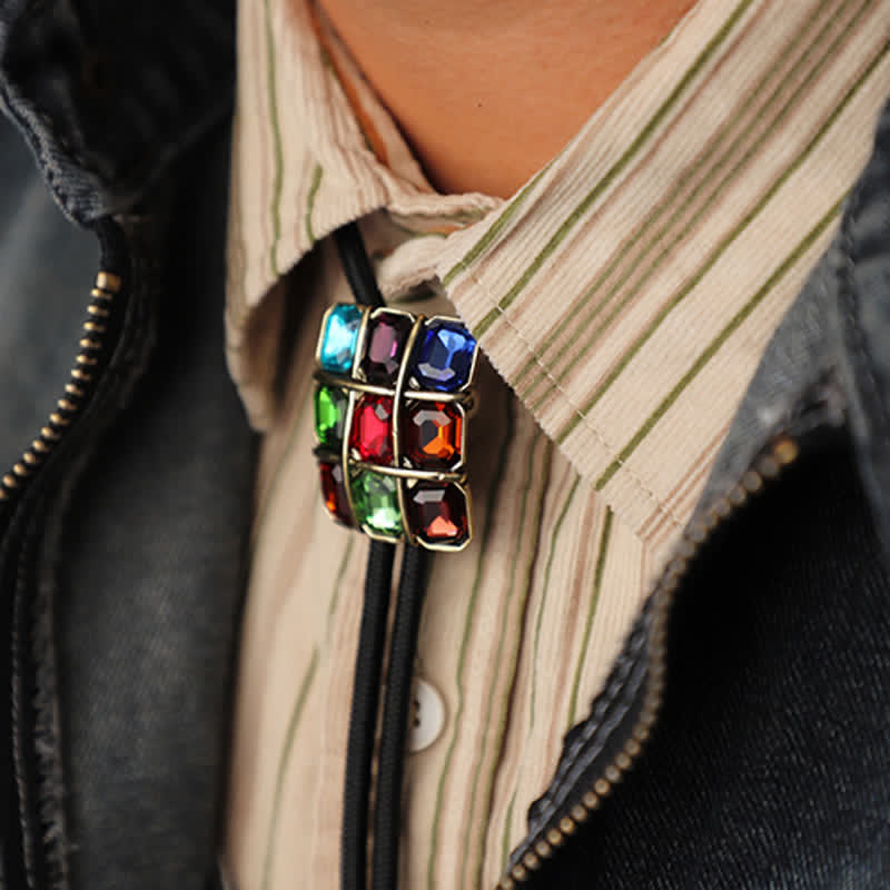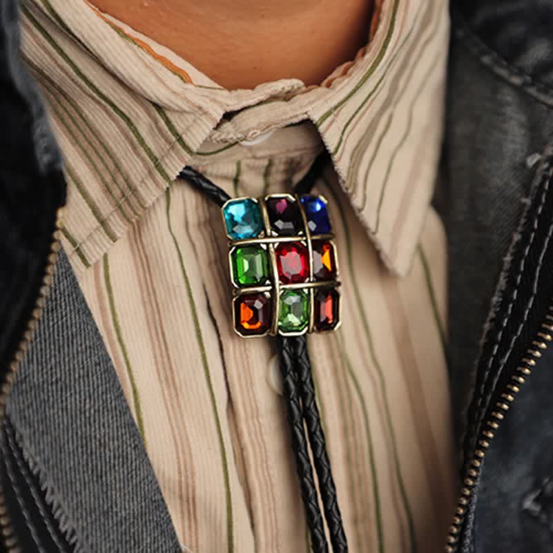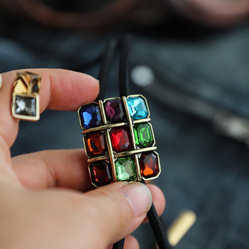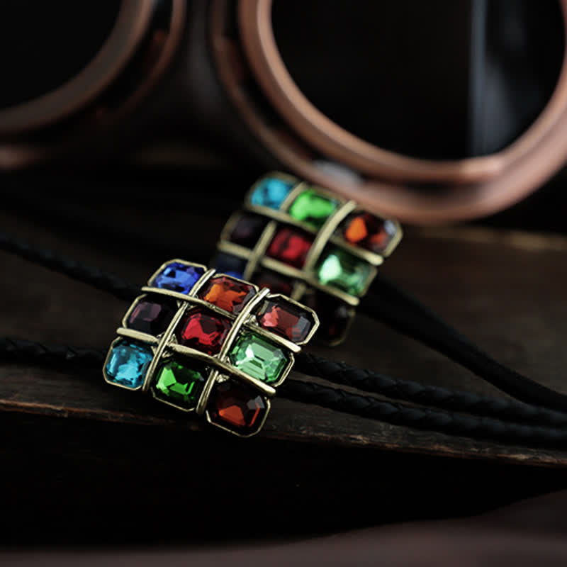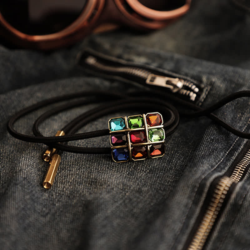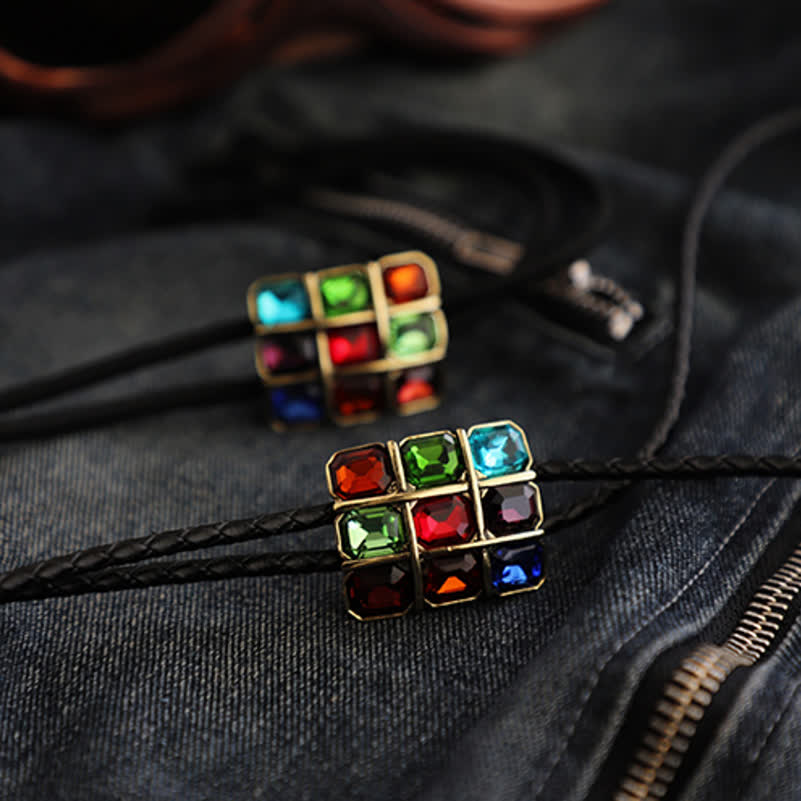 Accent your outfit with the Mosaic Cube Gemstone Bolo Tie, a contemporary twist on a classic. Its geometric cube pattern and vibrant, multi-colored artificial zircons inlayed bring a modern edge to any ensemble, perfect for the fashion-forward individual. Because it is hand-made, the color arrangement of the zircons will be different.
