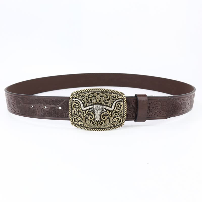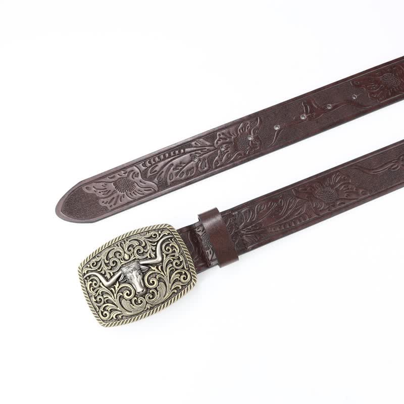 Silver bull head horn bronze buckle, symbolizing wealth, honor and courage, classic western cowboy style belt, great to show your charm. A versatile fashion accessory for men and women with delicate floral embossed pattern, stunning with any outfit.