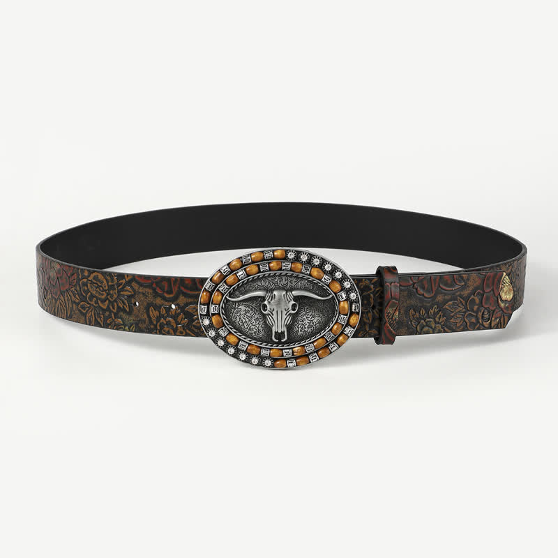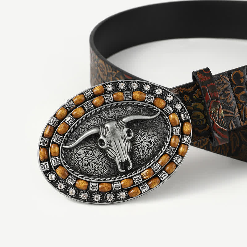 Men's Wooden Beads Carving Bull Head Leather Belt