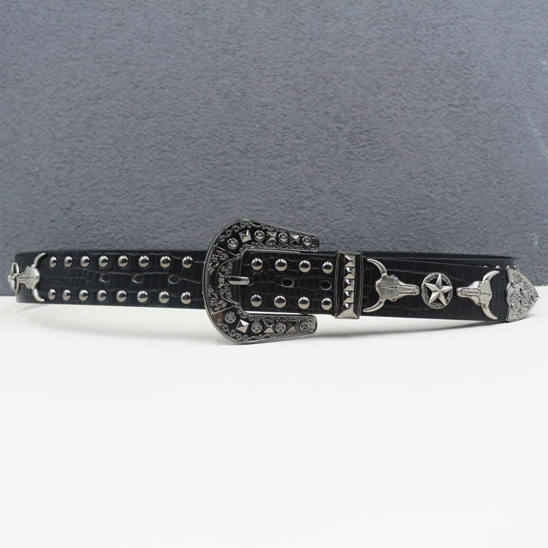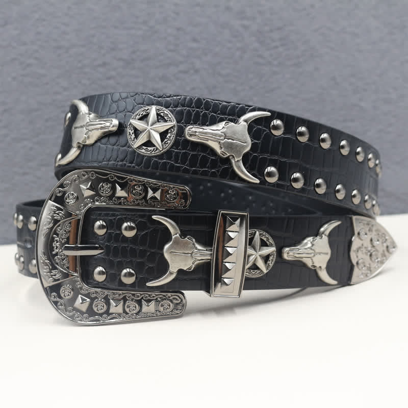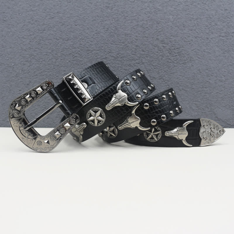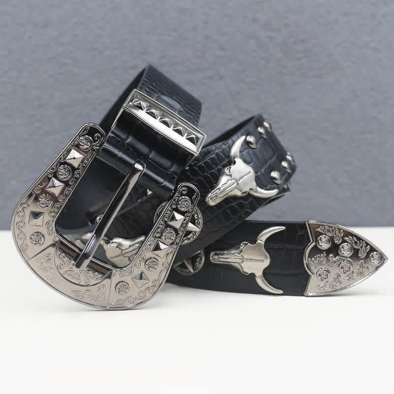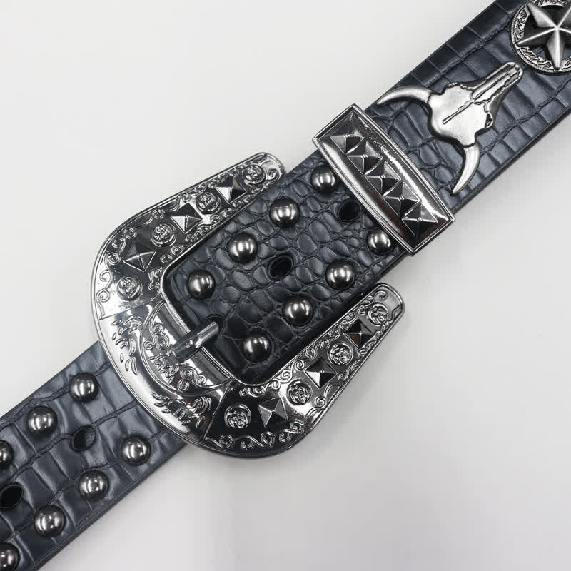 Silver Bull Head Rivet Black Crocodile Print Leather Belt