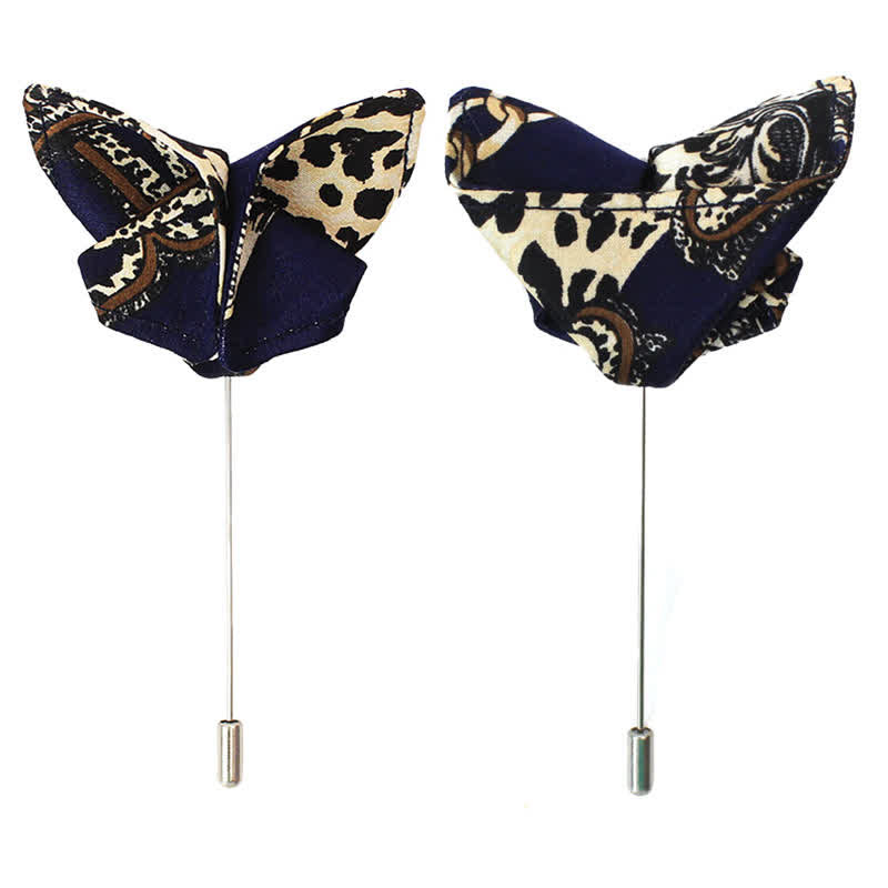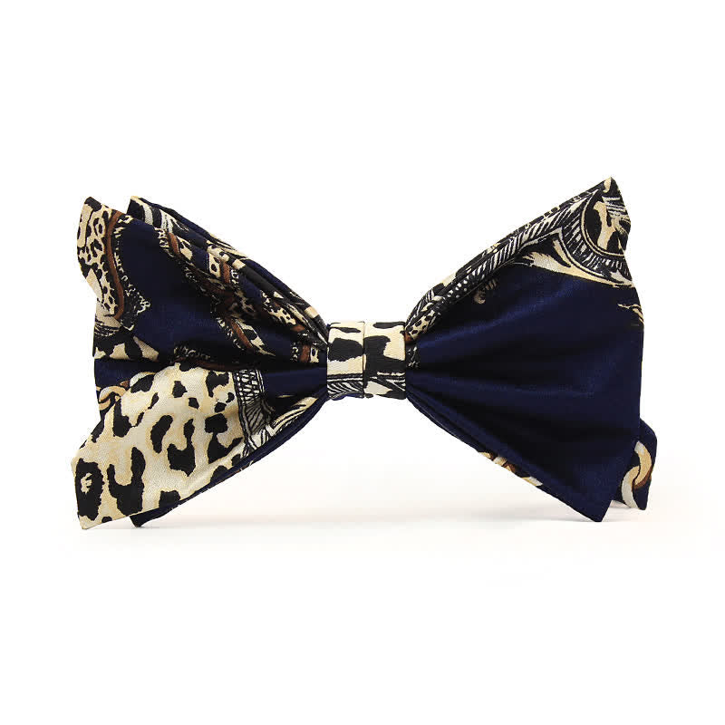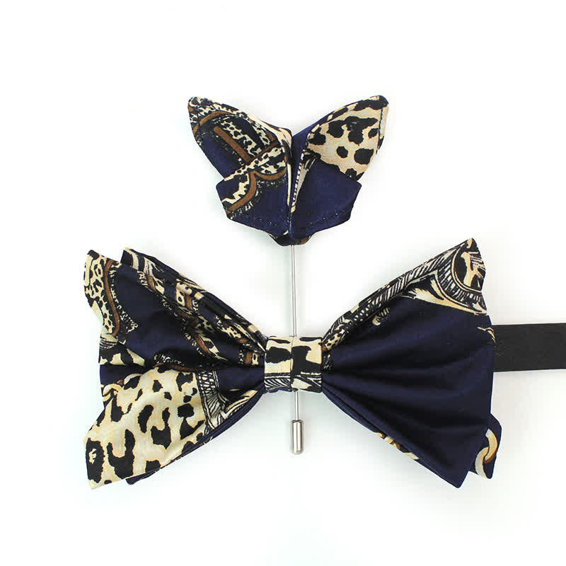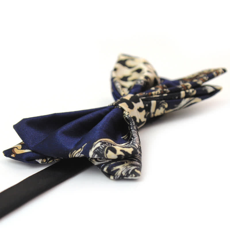 - This sophisticated bowtie is designed with a navy and beige pattern for a luxe touch.