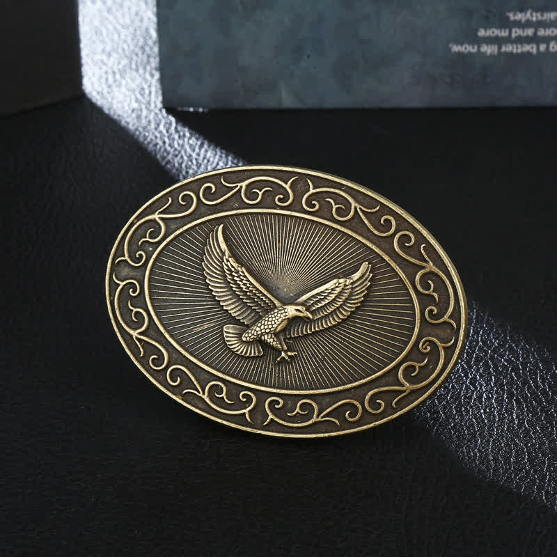 Antiqued talon-like swirls detail the border of this belt buckle, and a bald eagle spreads his wings front and center, ready for whatever may come his way because nothing says "Freedom" quite like the wide wingspan of an eagle.