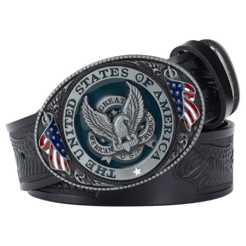 It features an spread eagle, American flags and stamped with THE UNITED STATES OF AMERICA. The belt showcases a stylish and timeless design that effortlessly complements any outfit. Its sleek and elegant appearance adds a touch of sophistication to your ensemble.