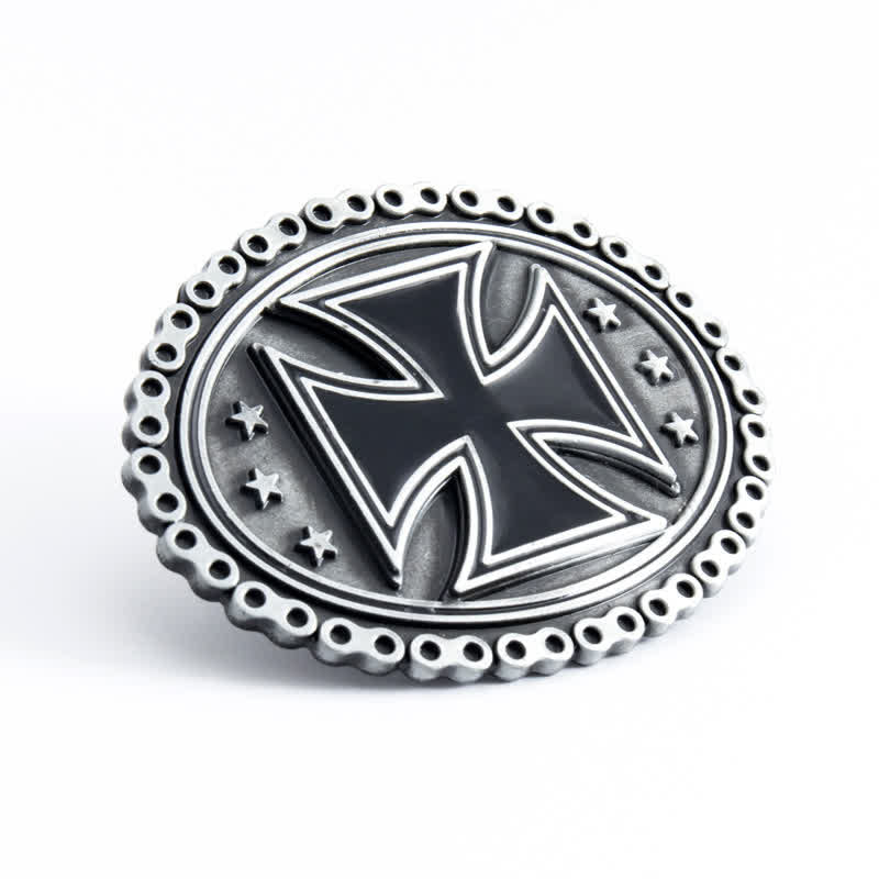 This Cross Belt Buckle features a big black cross in the middle and six stars were scattered on either side. This charming buckle was wreathed by a bike chain.