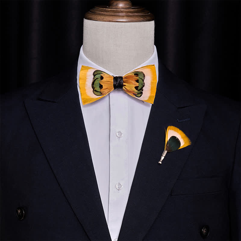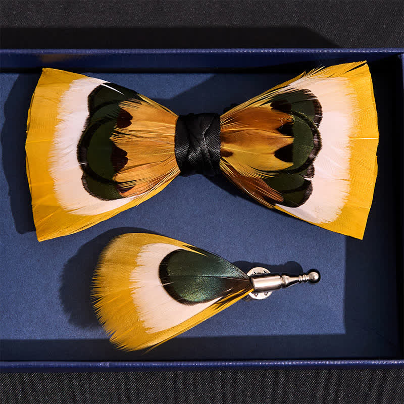 - Features: Use a combination of yellow pheasant and white & green goose feathers to create the beautifully and lively pattern of this bow tie, gives each finished piece unique coloring.