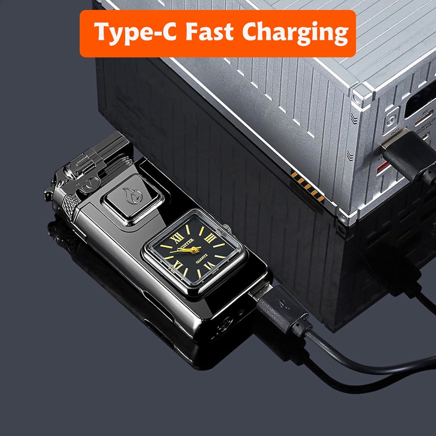 - This is a refillable butane jet flame torch lighter with a built-in quartz watch and a decorative gun-shaped design.