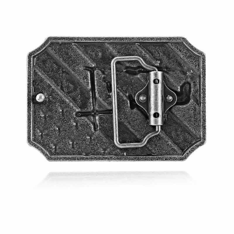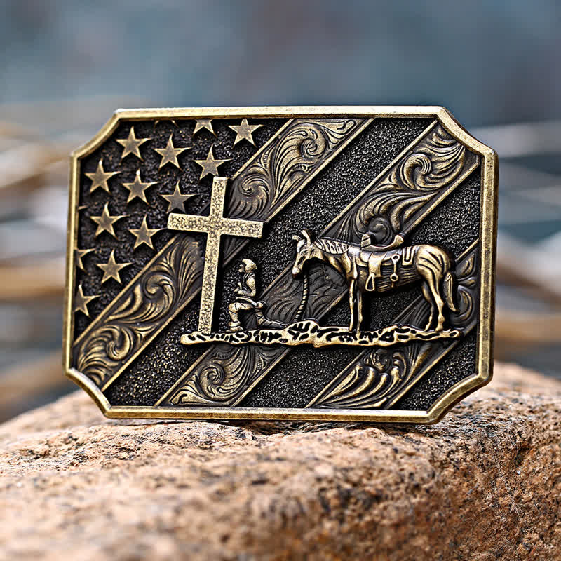 It has the scene of an American Flag covering the entirety of the belt. In the center, a patriot person kneeling at the cross is placed. Made of durable alloy, this belt buckle is built to last and withstand everyday wear and tear.