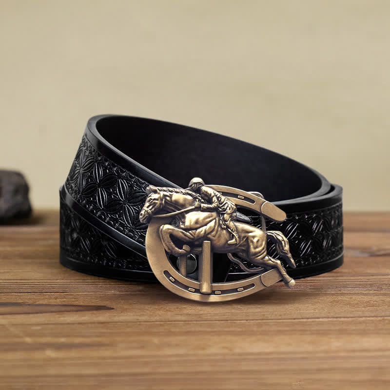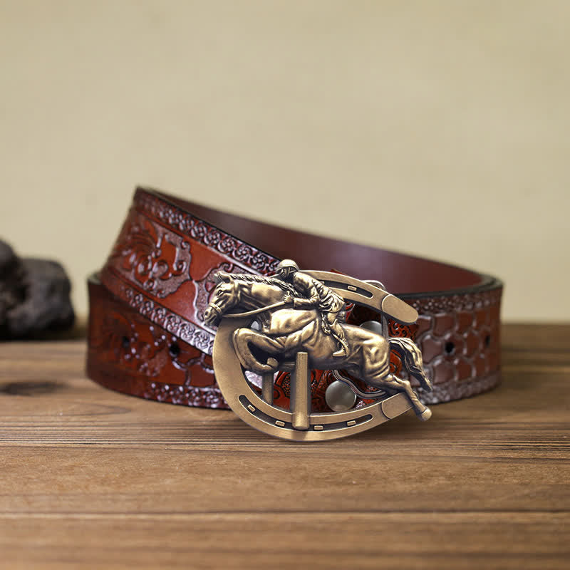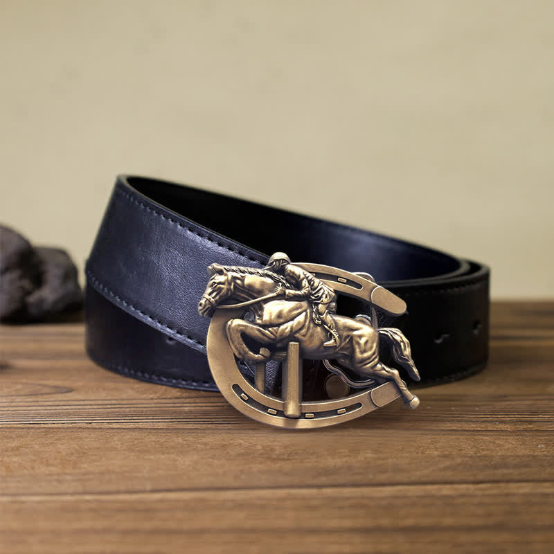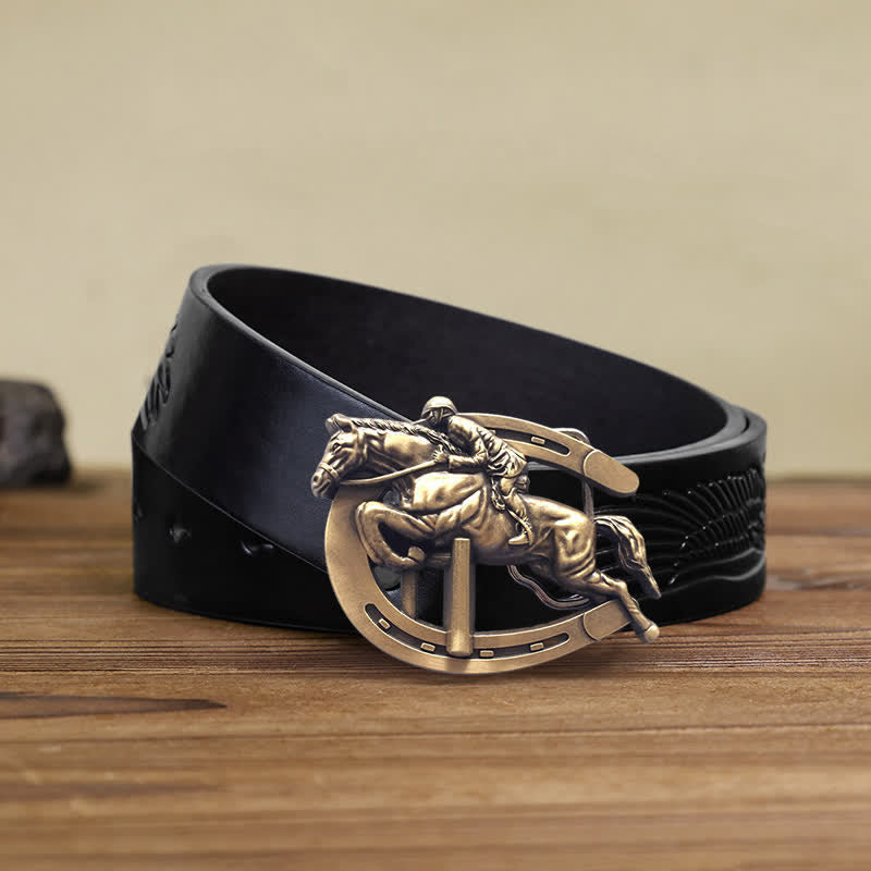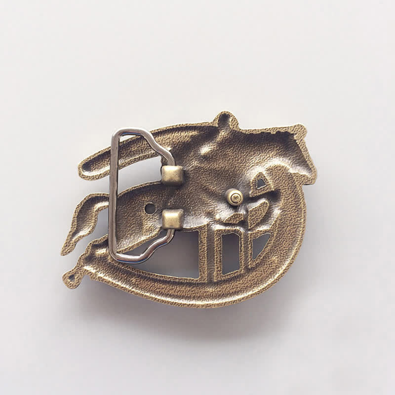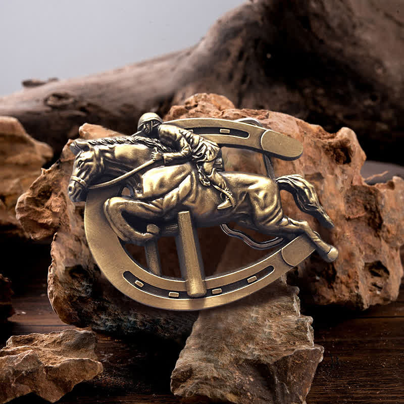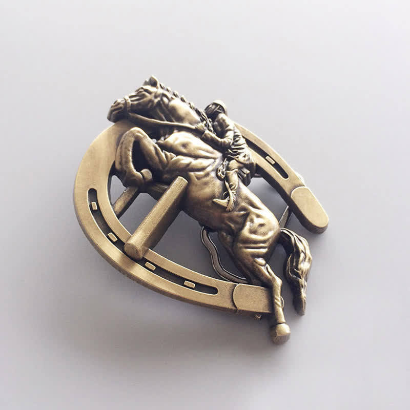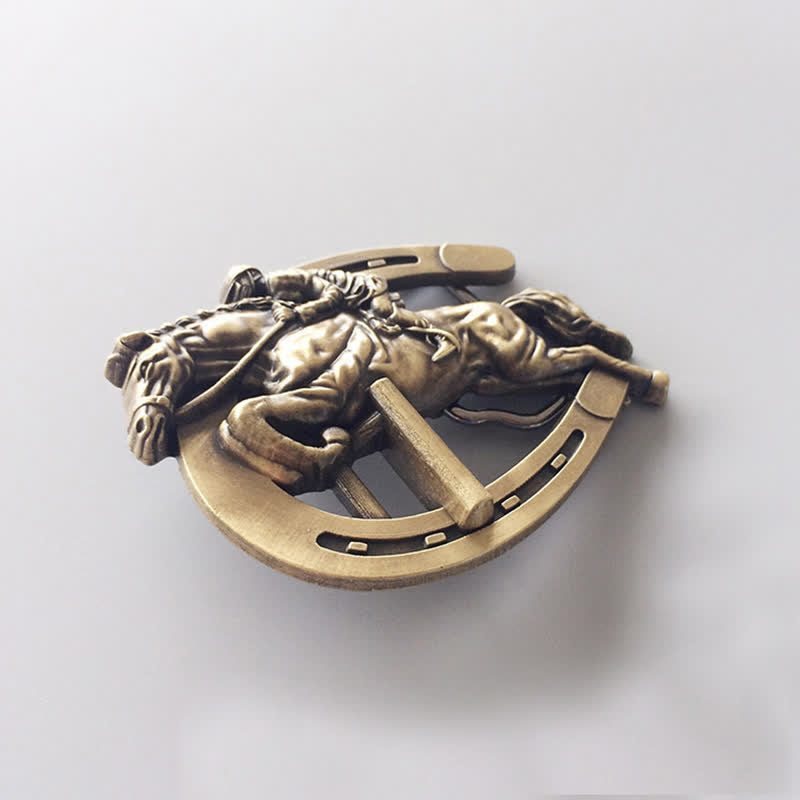 Off to the Races! The horse & jockey are sculptured and set in a racing type horseshoe frame. It is a 3d buckle that has nice details.