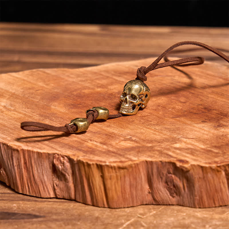 Motorcycle Accessory Brass Skull Head Leather Keychain - Skull - image 0