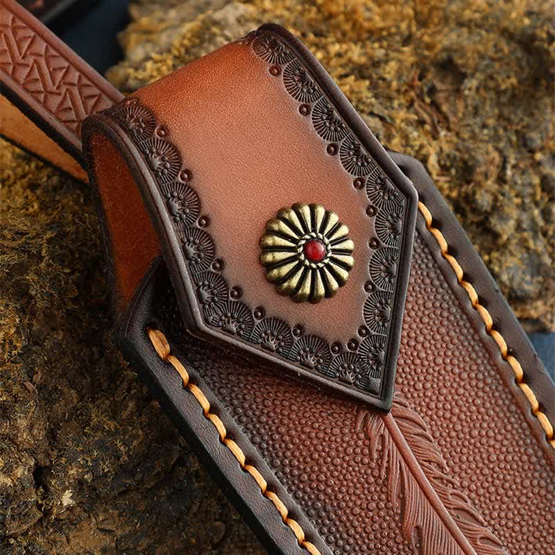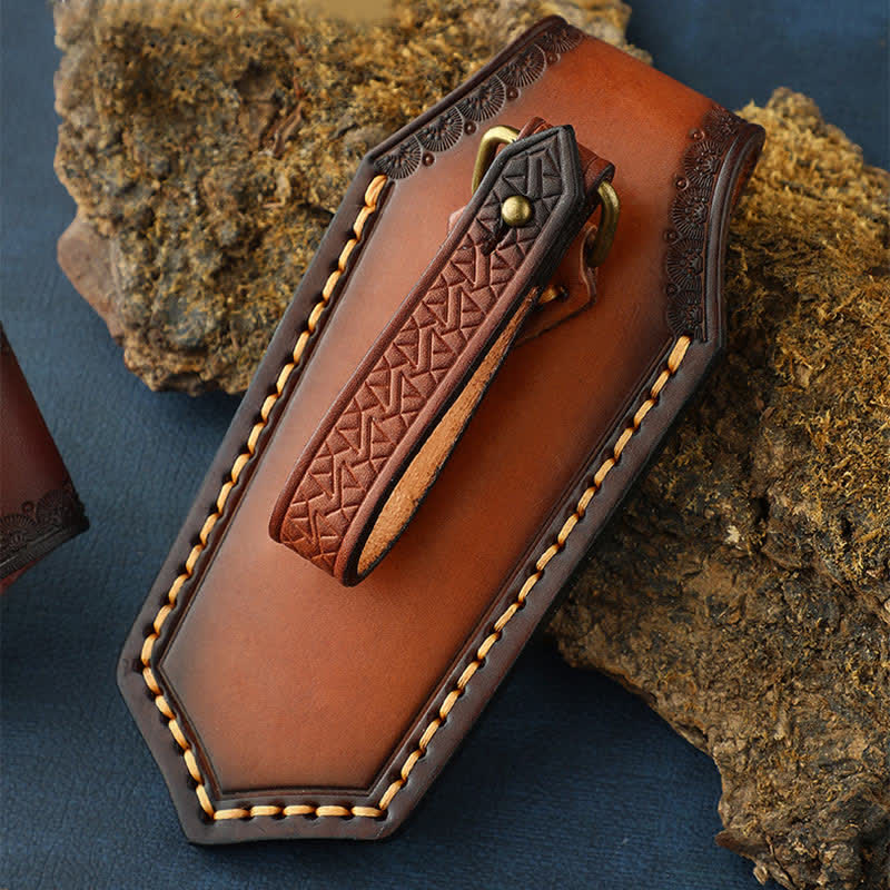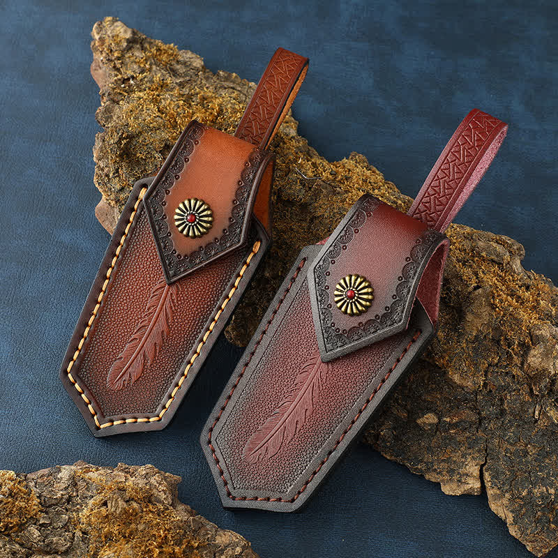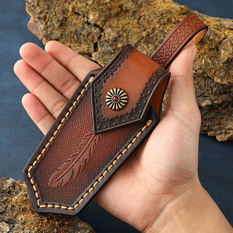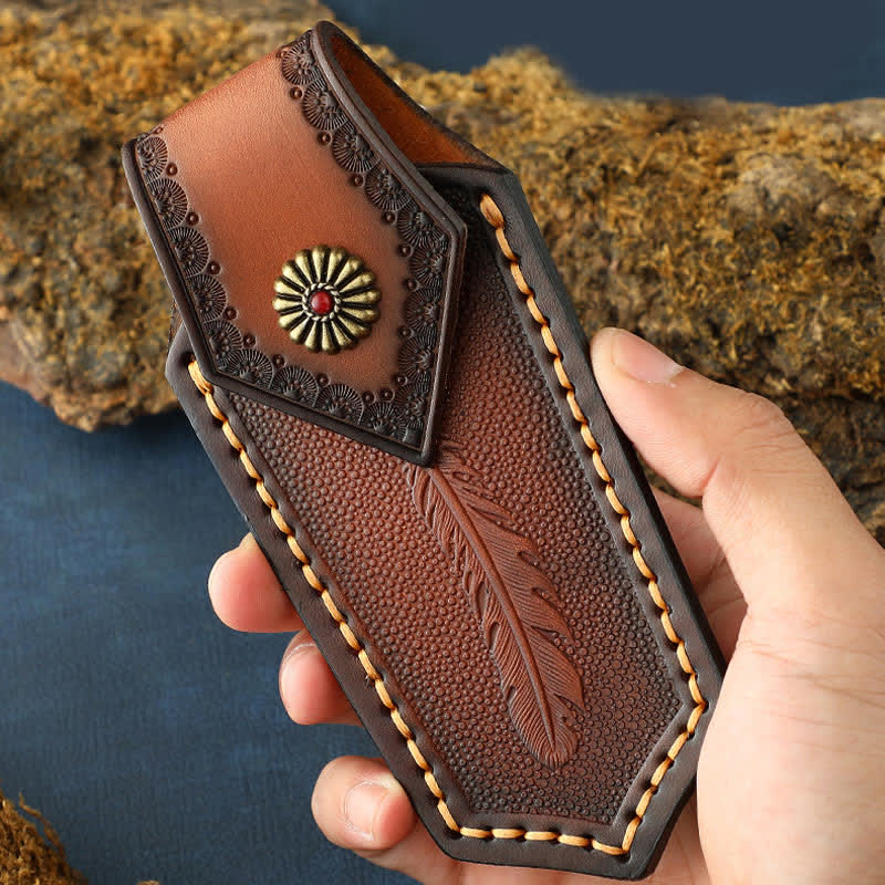 Flip Cover Feather Embossing Folding Knife Sheath Leather Belt Bag