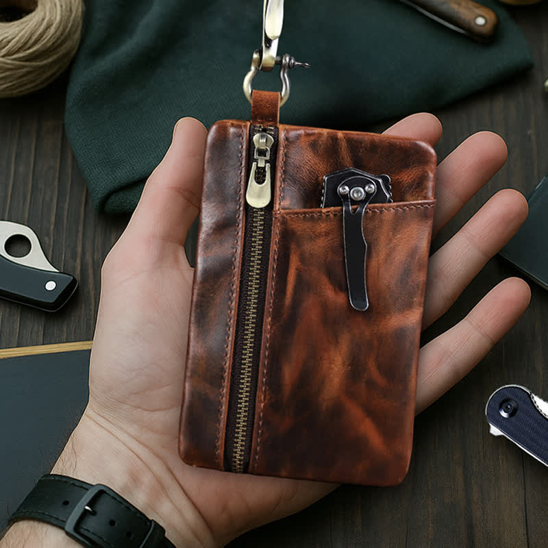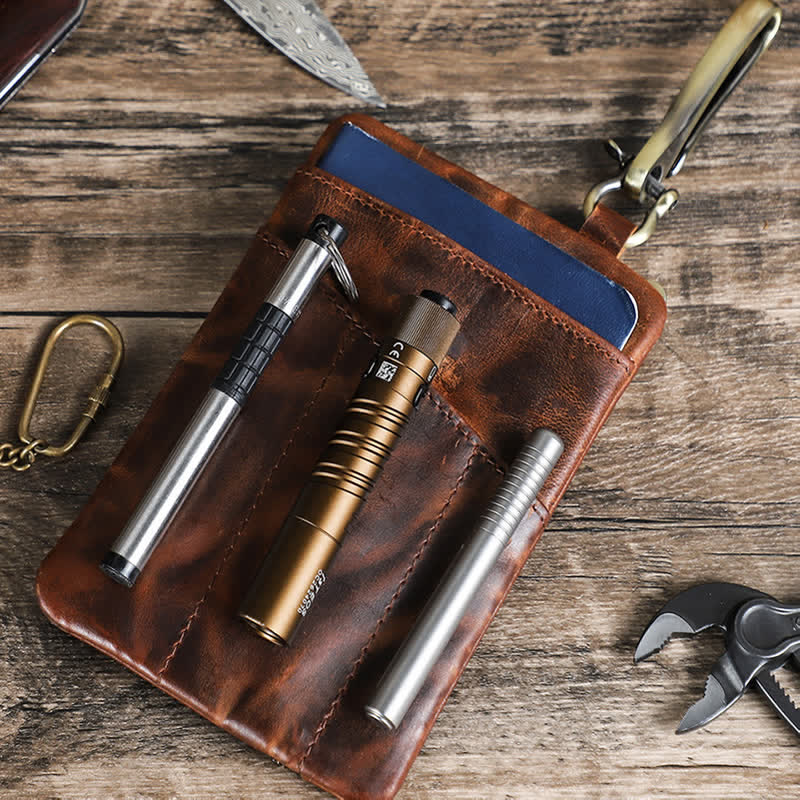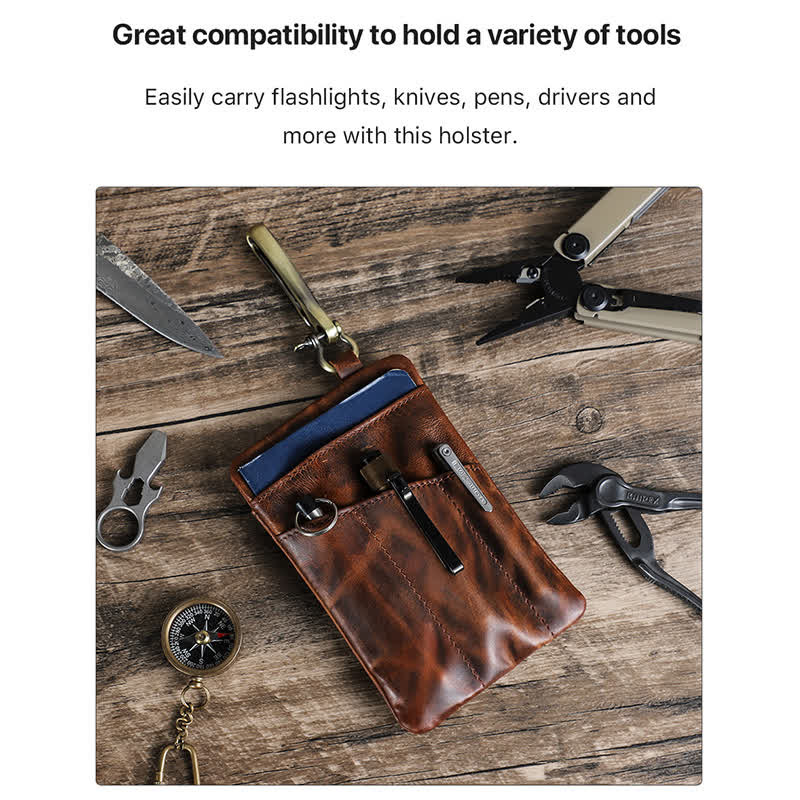 The leather was treated with a rugged and distressed effect, and it gets better with age. All in one EDC sheath, owning an tool leather sheath can hold all your EDC gears, multitools, pens, flashlights, knives, keep them organized, hold them in place, and not lose any parts. It's suitable for outdoor activities.