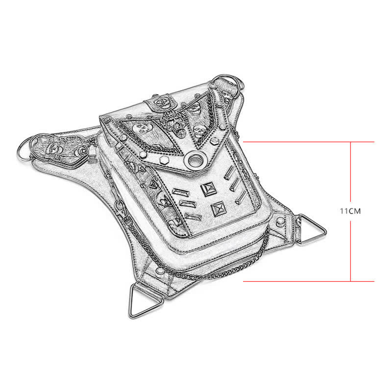 - A unique look that is hands free functional. Lots of cool detailing including a silver chain, grommets, studs, skulls.