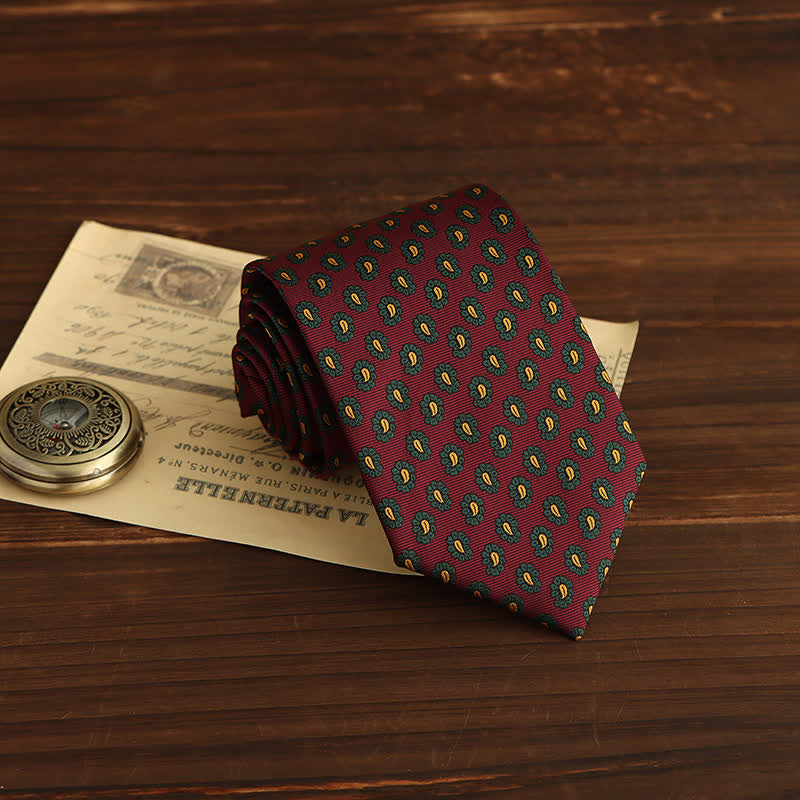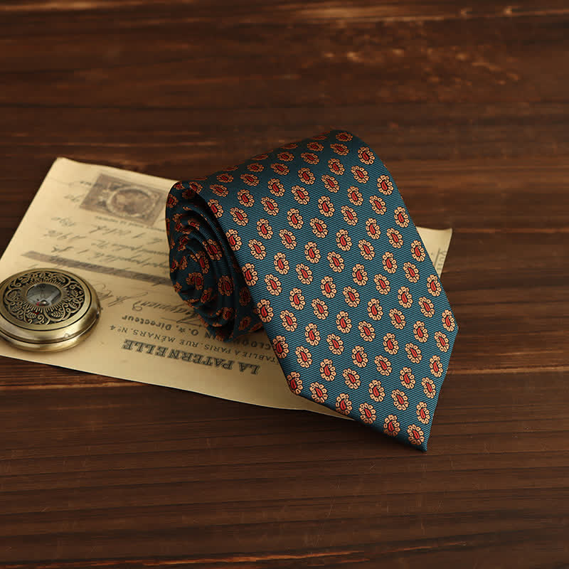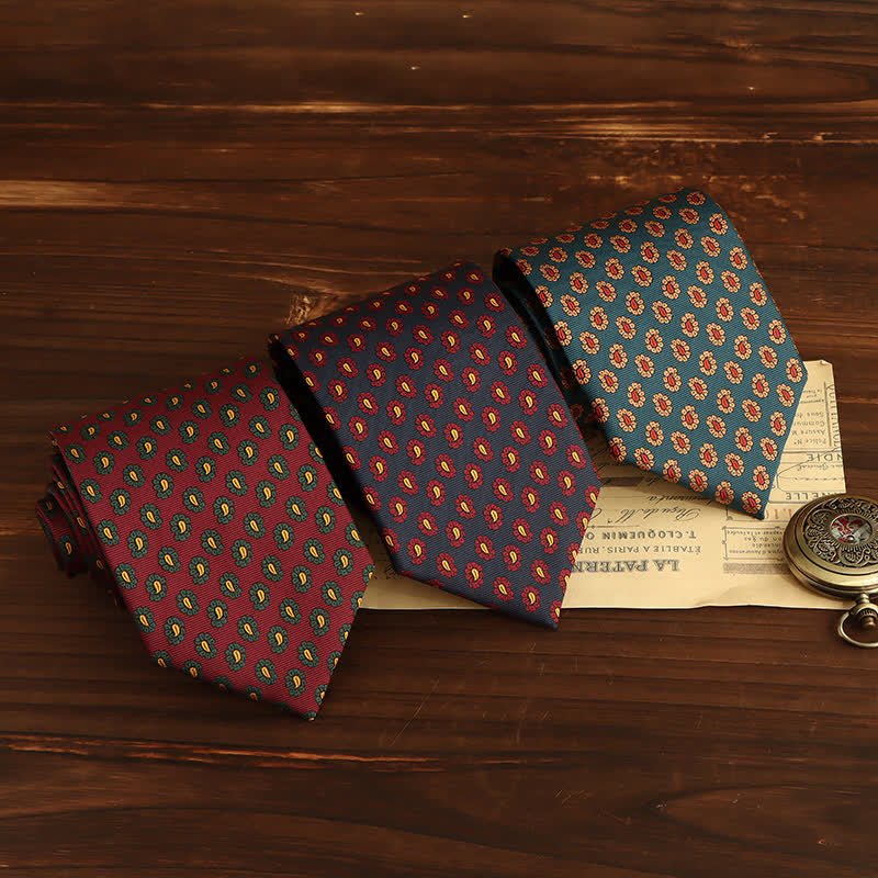 The paisleys are simplified and stylized, updating this traditional design for the fashion forward man. It is an incredibly sophisticated necktie that features small red, yellow or green paisleys with flower pedals.
