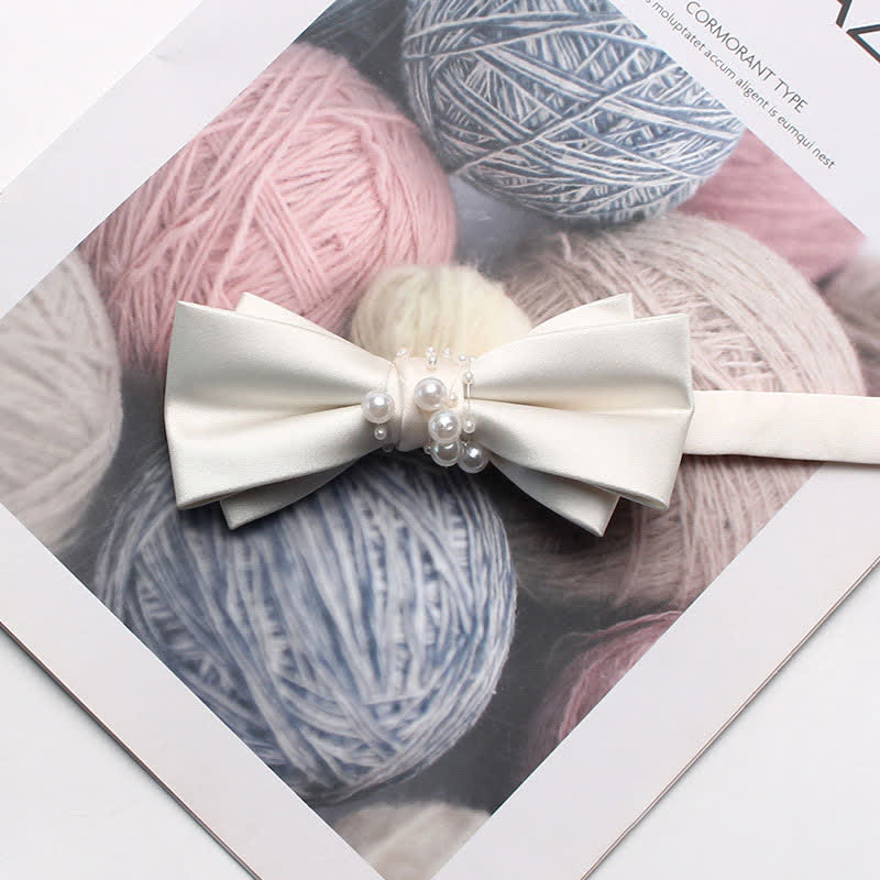 - The center of the graceful ivory bow tie is embellished by assorted size pretty pearls.
