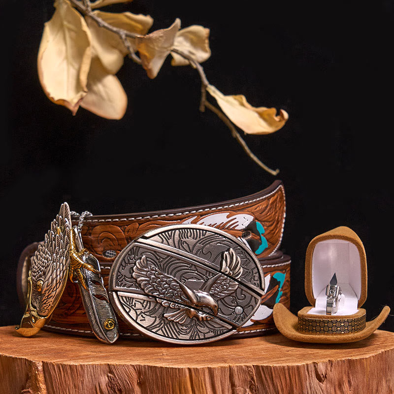 - Package: 1 Soaring Eagle Knife Buckle, 1 Bald Eagle Hidden Knife Pendant, 1 Ring with 1 Cowboy Hat Ring Box
