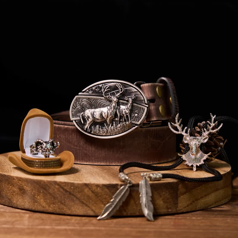 - Package: 1 Deer Buckle, 1 Deer Head Bolo Tie, 1 Ring with 1 Cowboy Hat Ring Box