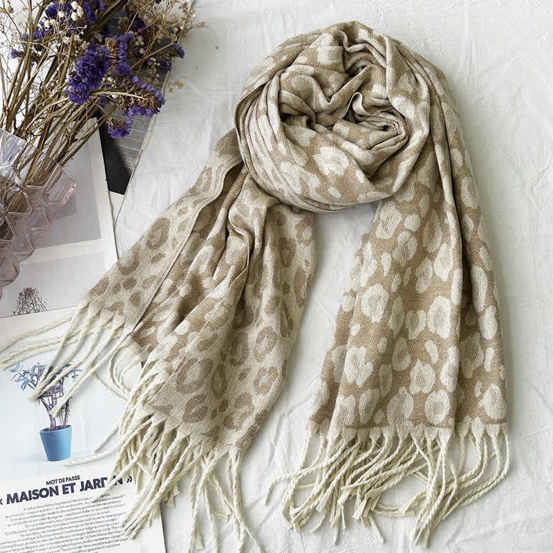 The beautiful fluffy soft scarf in jacquard weave is simply a beautiful detail. The motif is not printed, but created by the weaving of two different yarns. The elegant pattern and the loose fringes at the ends are timeless elegant.