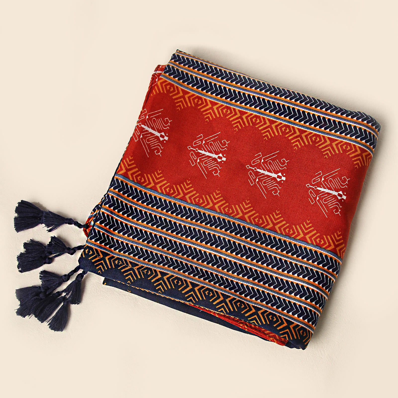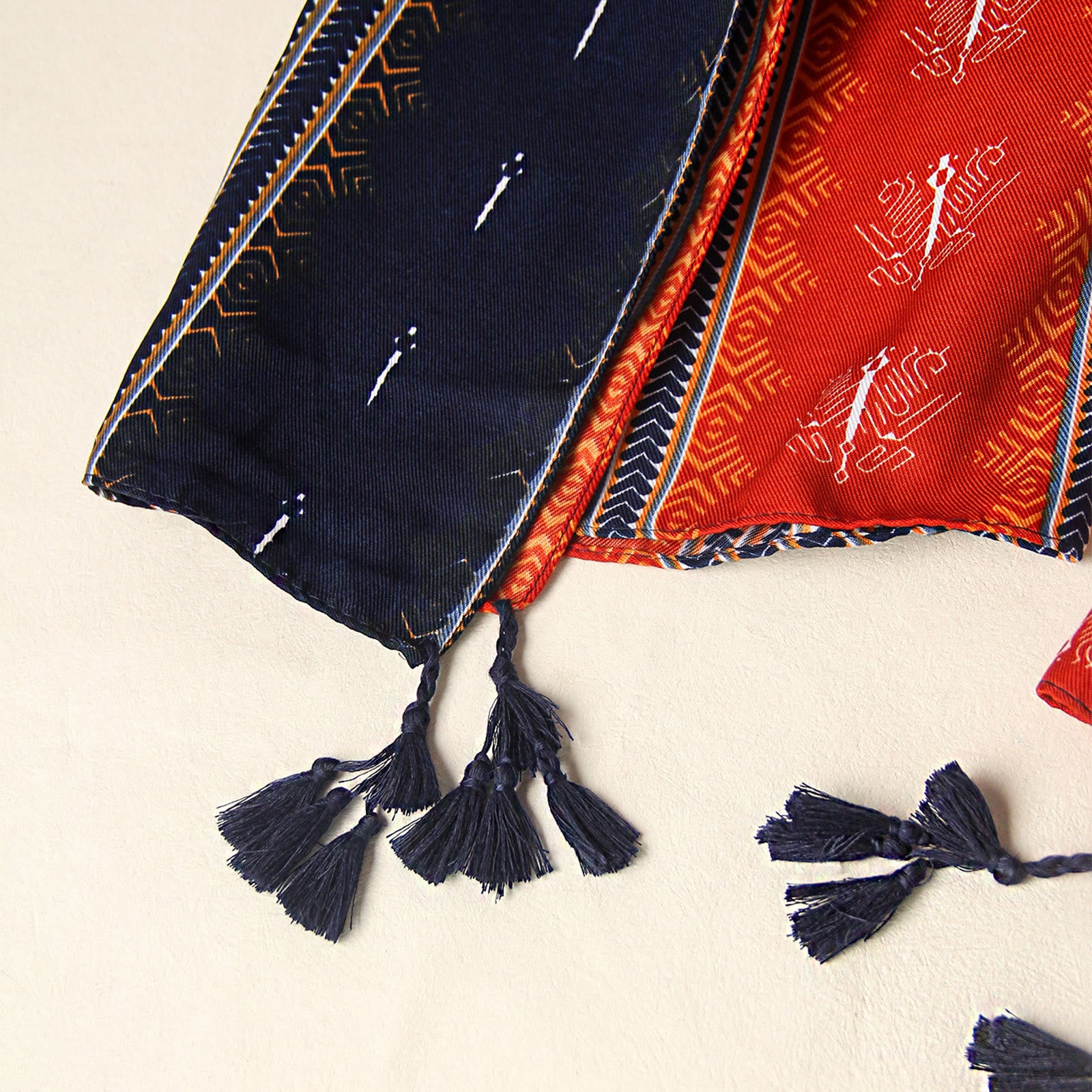 This scarf showcases distinctive ethnic-inspired patterns set against a bold red and navy blue dual-tone palette, accented with neatly crafted tassels that amplify its unique artistic vibe. This versatile accessory can be styled as a shawl, neck scarf or shoulder wrap to elevate daily casual ensembles or leisure outfits. Suitable for year-round wear, it also serves as a wonderful gift option for fashion enthusiasts who favor ethnic-style accessories.