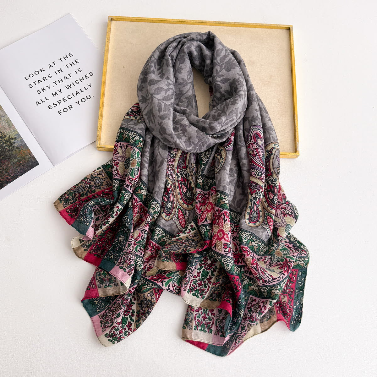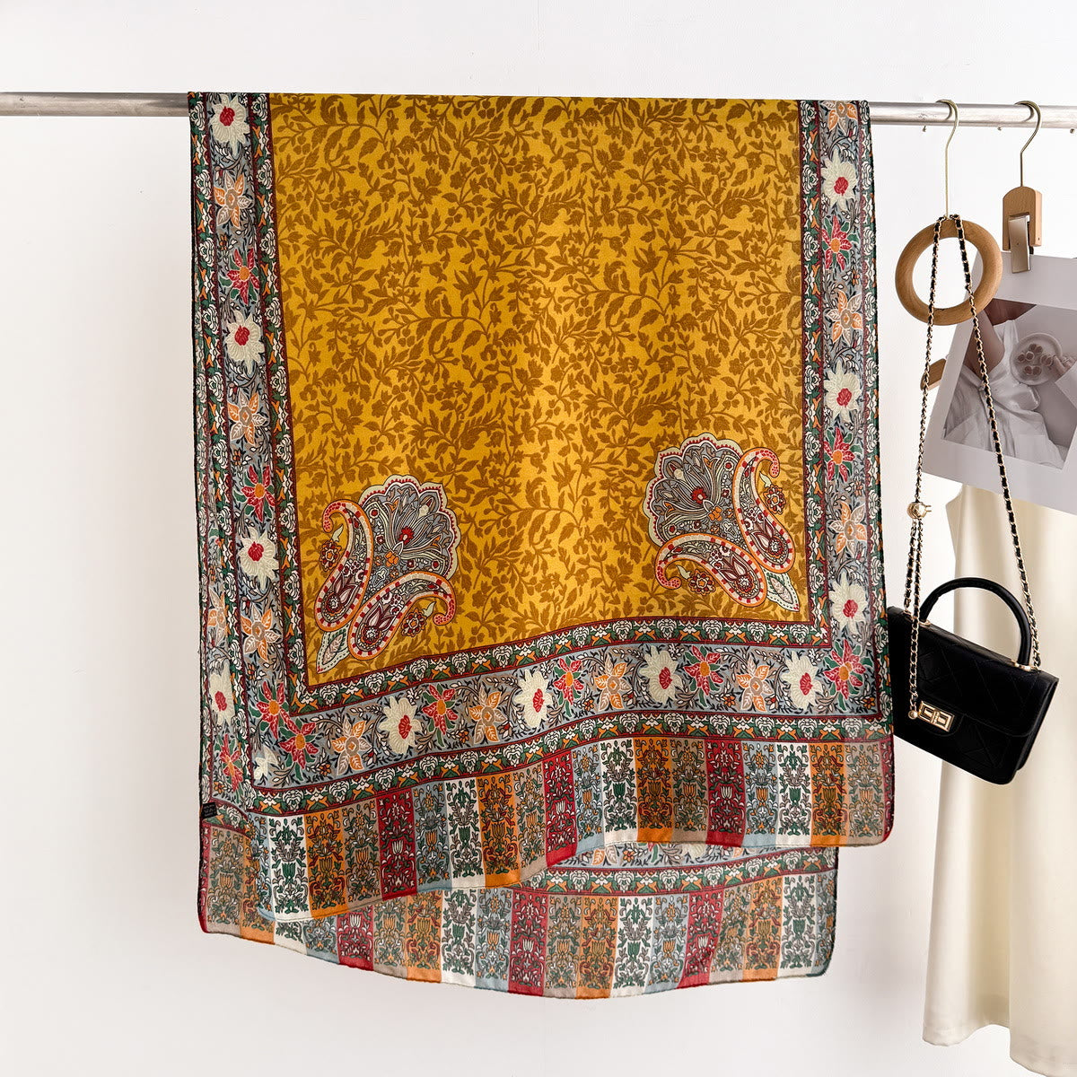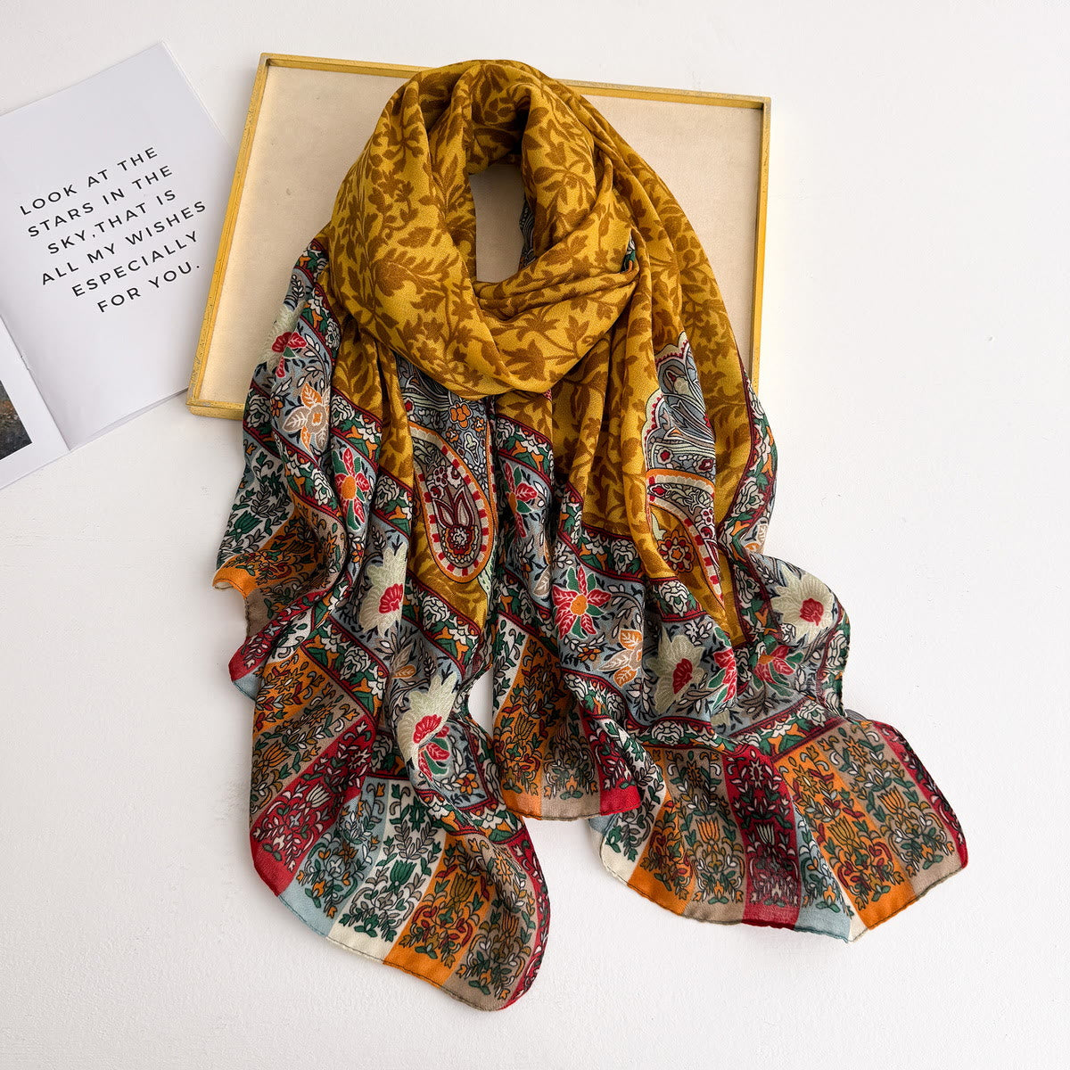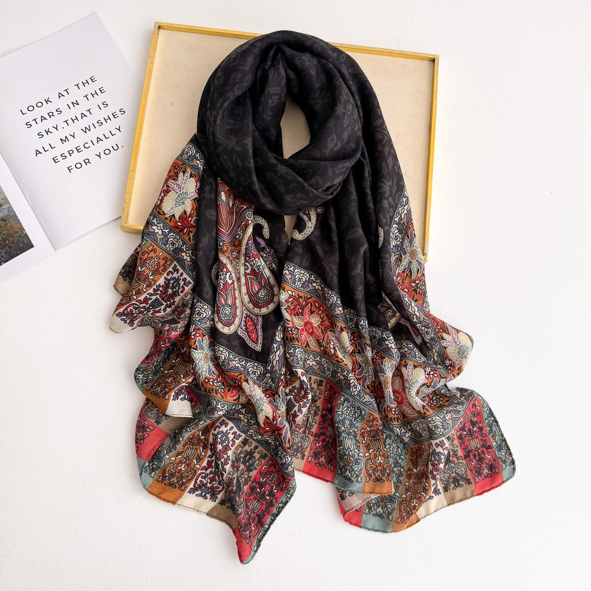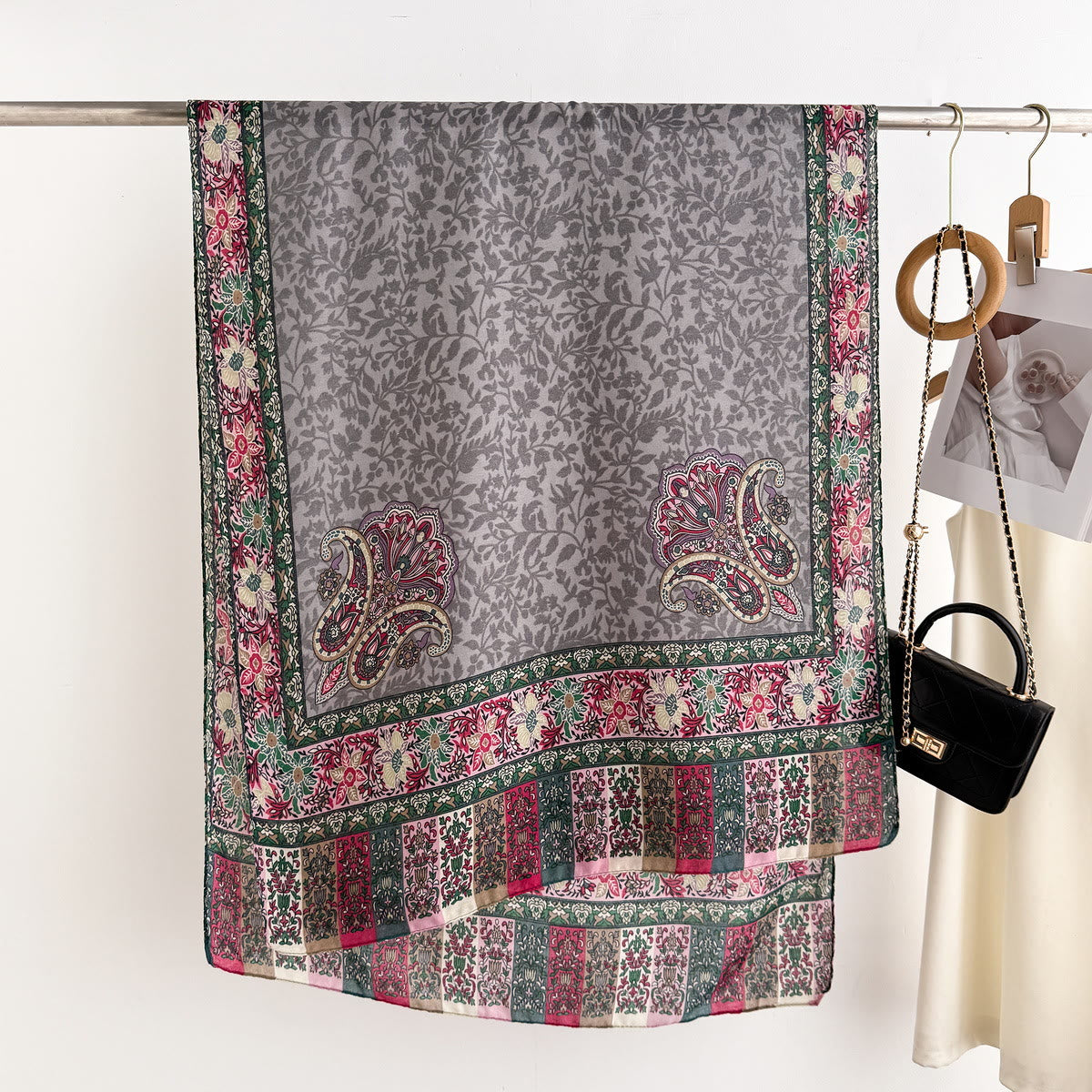 Crafted from lightweight flowy fabric, this scarf features elaborate retro patterned details that add rich artistic layers and elegant drape. It comes with soft and breathable texture for comfortable wearing. You can style it as a neck scarf, shawl, or bag decor to elevate your look. Suitable for all seasons, it also makes a charming gift for fashion lovers on holidays or special moments.