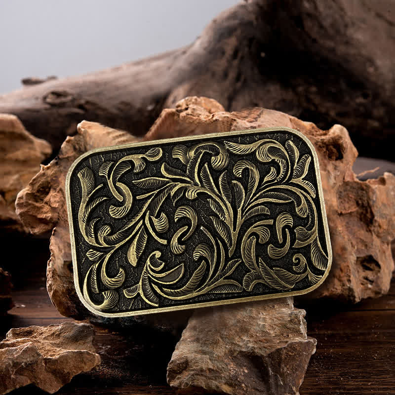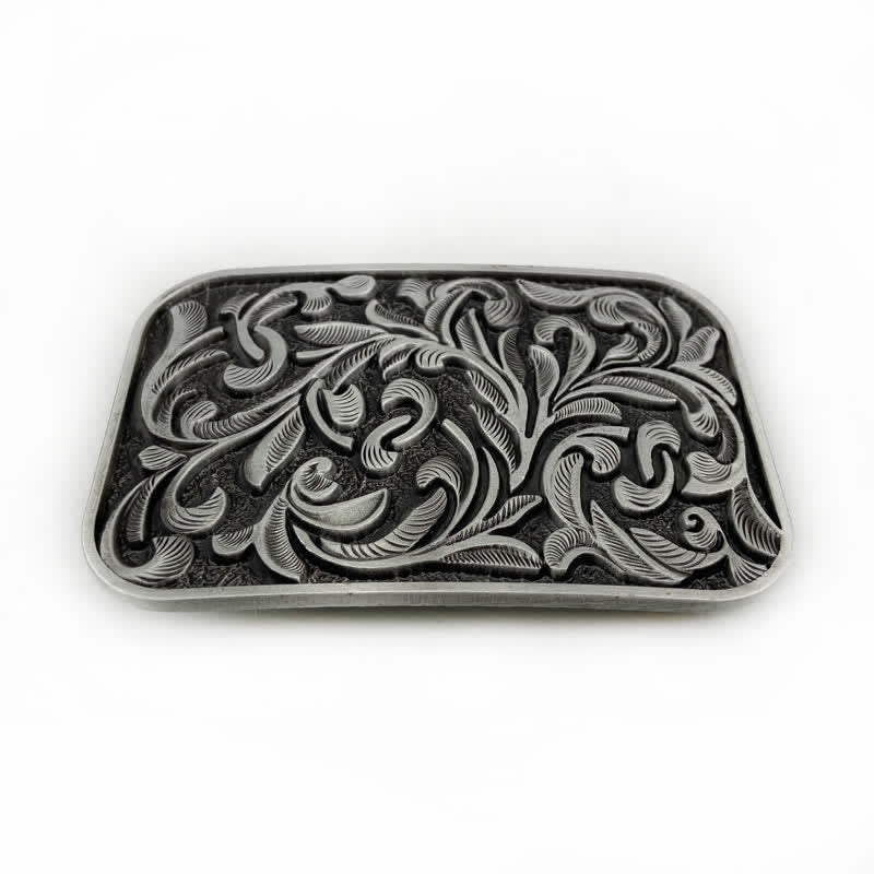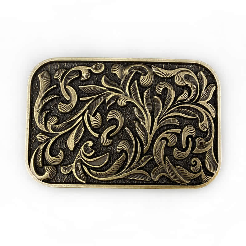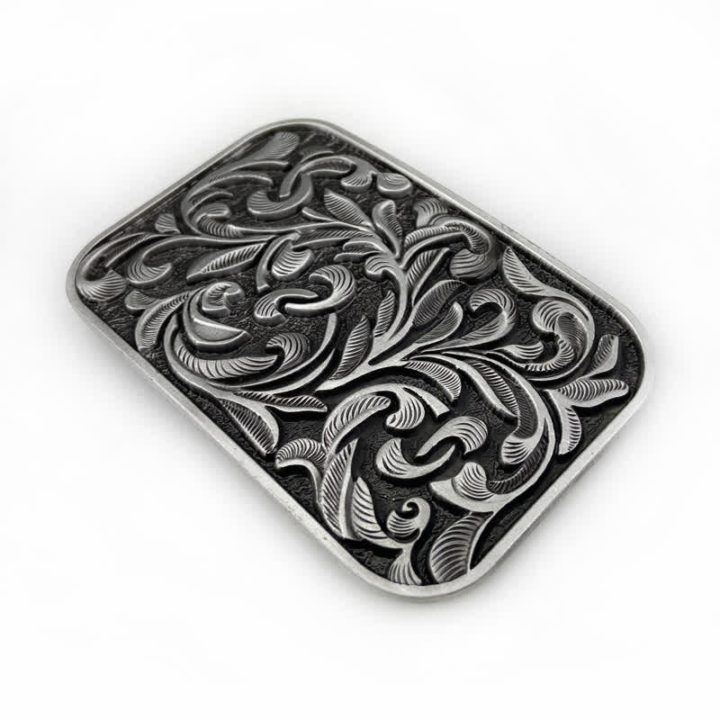 This rectangular classic buckle was crafted to catch attention with its intricate antique leaves. Traditional in shape and size but luxurious in detail.