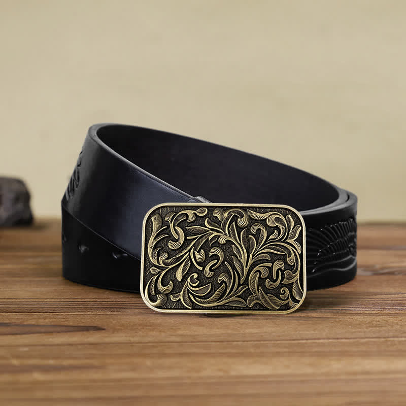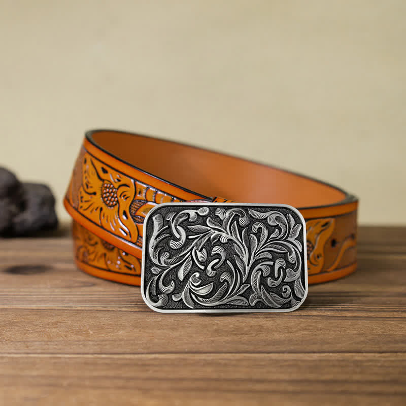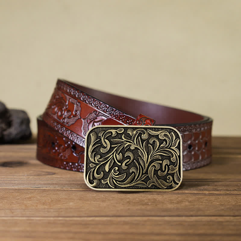 Men's DIY Art Leaves Scrollwork Buckle Leather Belt