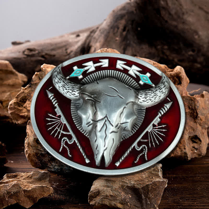 This is a really handsome belt buckle with a Native American theme. The steer skull fills the center of the buckle with Indian designs in white and blue. Surrounding it against a dark red or black background.