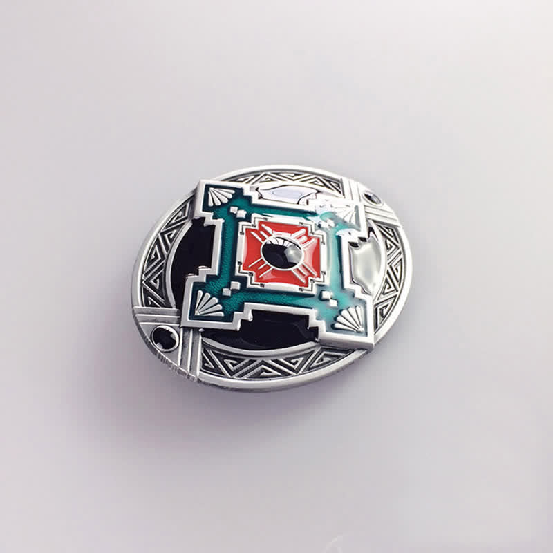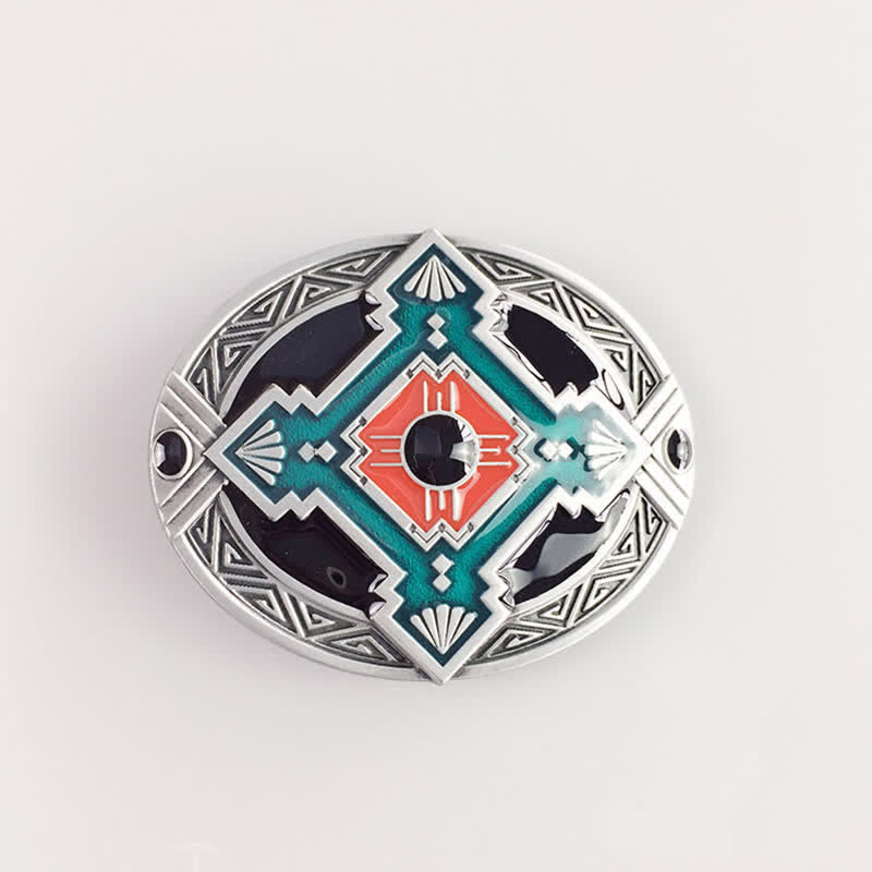 This native western belt buckle features a native art-inspired geometric design in red, black and blue enamel. This western belt buckle makes a good gift for art lovers.