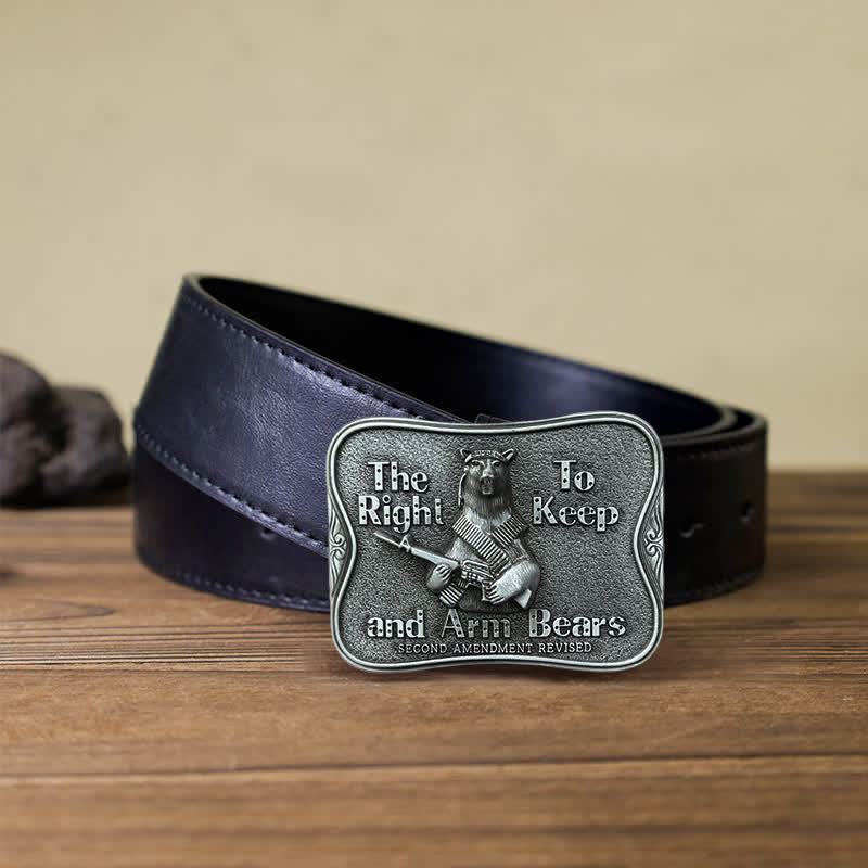 Novelty Arm Bears Buckle with a bear holding a rifle and the saying "The Right To Keep and Arm Bears".