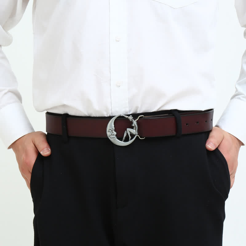 Vintage buckle features the moon with a naked woman sitting on the rim. The naughty moon is winking at the sexy babe.