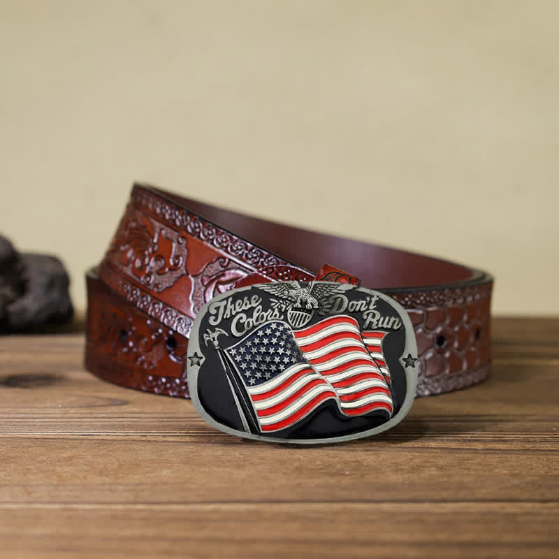 Get your western on with this men’s belt buckle. This oval buckle has a USA flag and an eagle with the words “These Colors Don't Run” etched on it.