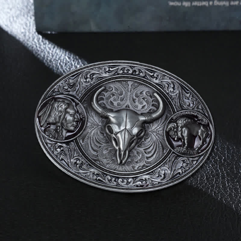 This buckle features a bulll skull buffalo and Indian head on each side with a dark red background. Its distinct style will inject a lot of personality into your everyday attire.
