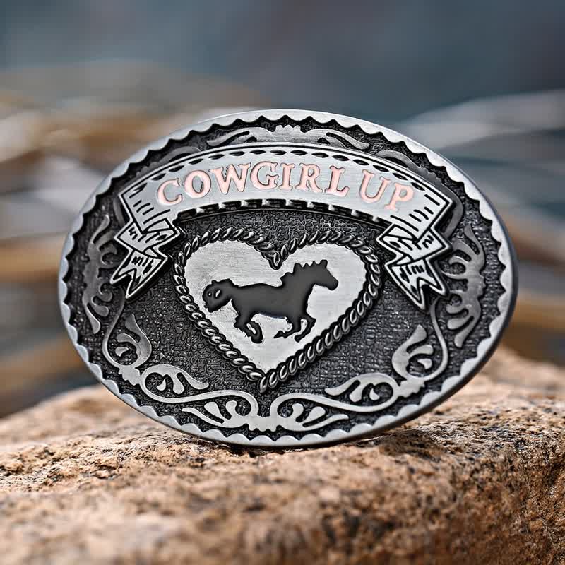 Dark silver with floral scrip, a detailed hear with the silhouette of a horse, and a banner reads in pink COWGIRL UP. Show your western heart and your toughness with this buckle.