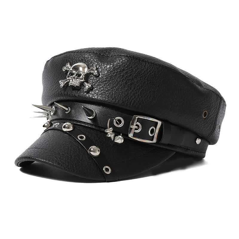 Women's Stylish Skull Rivet Navy Cap Black Leather Beret Hat