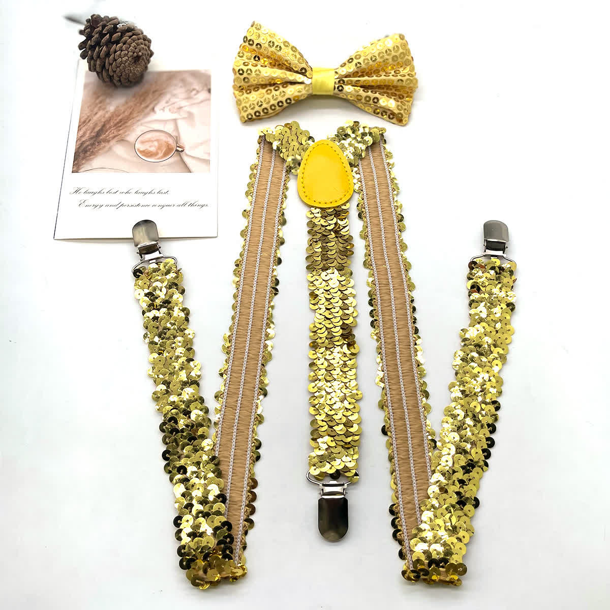 • This shiny sequin suspender & bow tie set is a unique and versatile way to provide pant support, you can spruce up your formal attire.