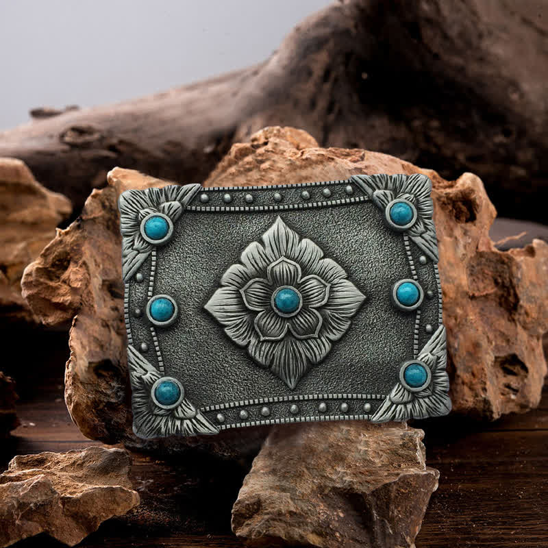 This particular buckle has 7 artificial turquoise stones set in the carving floral pattern. It is an elegant western style accessory.