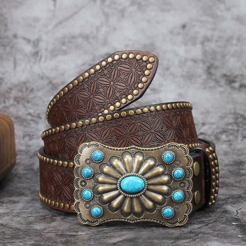 Western all around, this belt features a floral-embossed pattern accented with faux turquoise stones. Carved flower pattern runs the entire belt for a richly detailed look. Perfect for a night on the town.