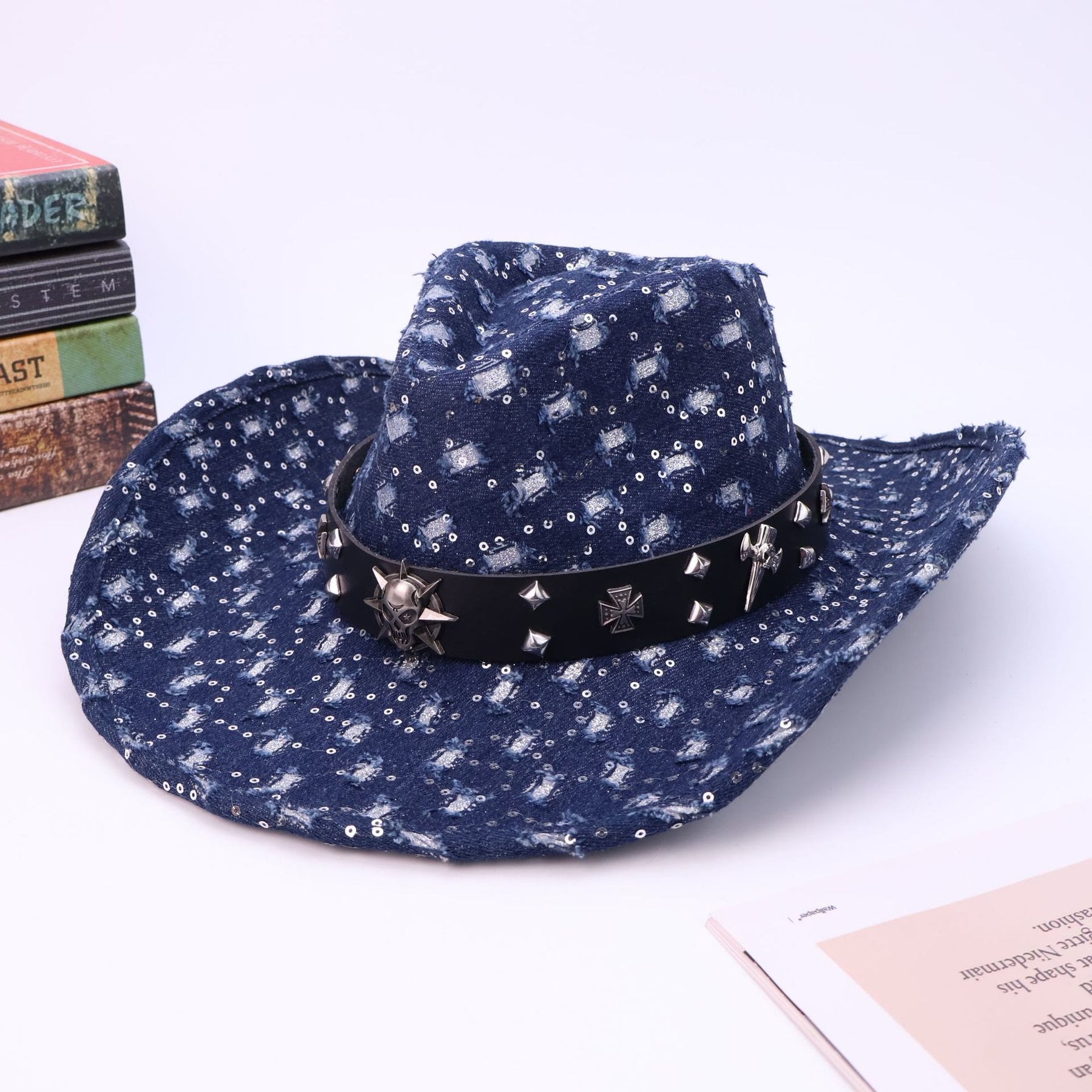 This cowboy hat is paired with a black leather strap, which features punk style accessories such as metal rivets, skull heads, and crosses. Designed for winter travel and warmth.