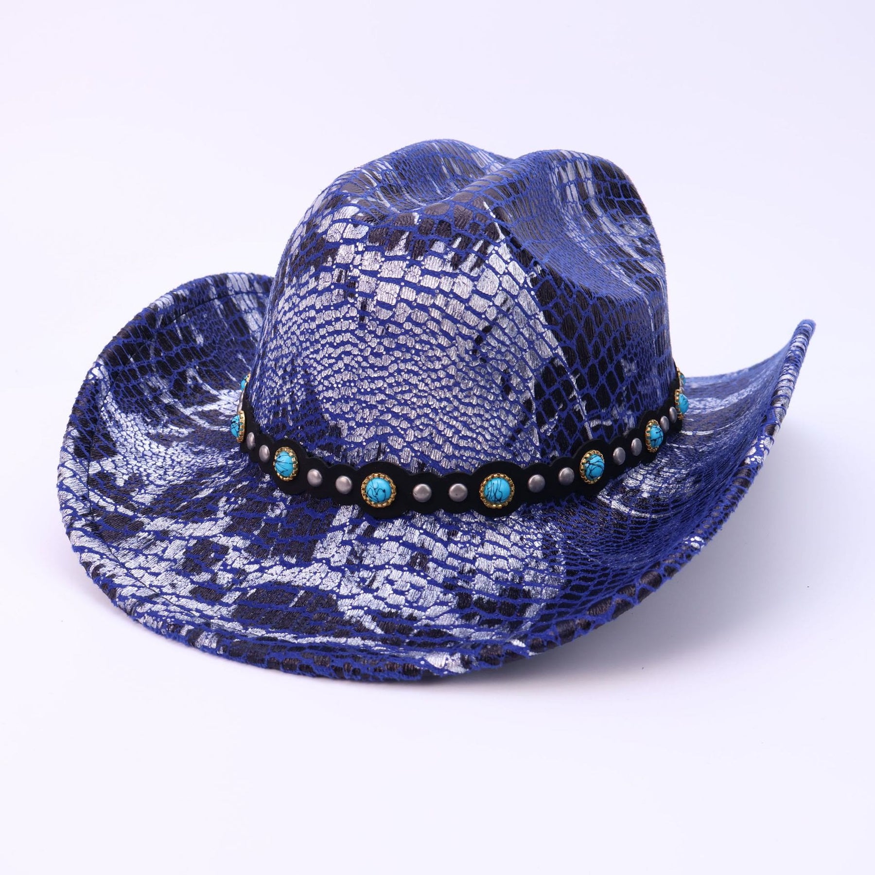 - This hat features crocodile pattern as the base, paired with turquoise black trim, blending Western retro and wild trendy elements.